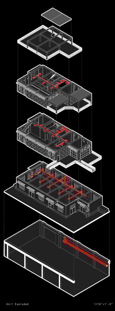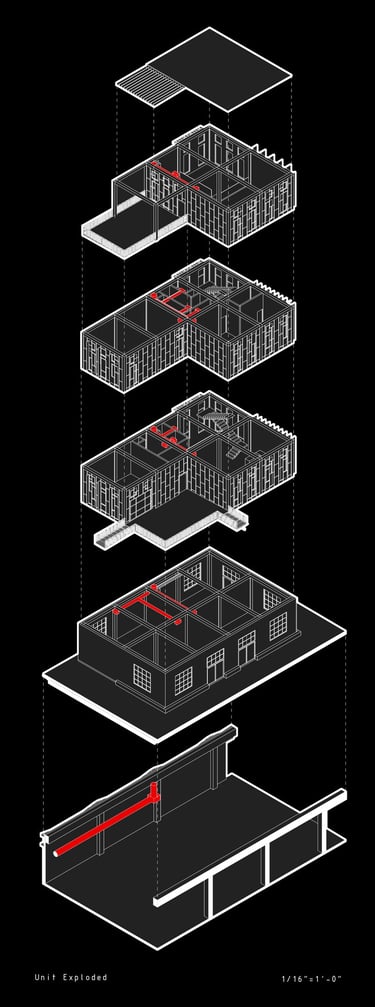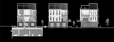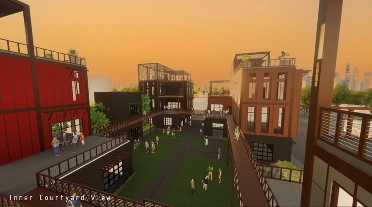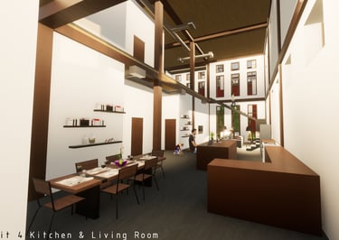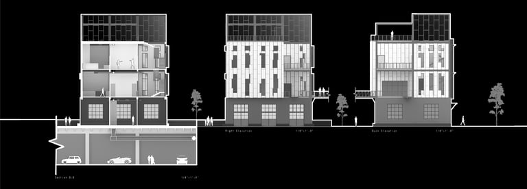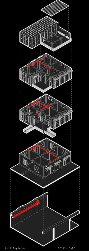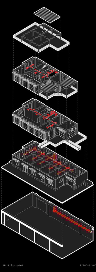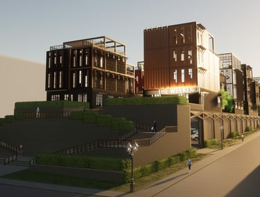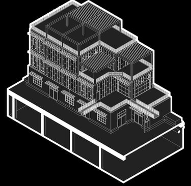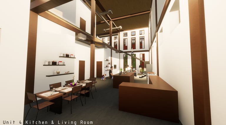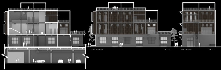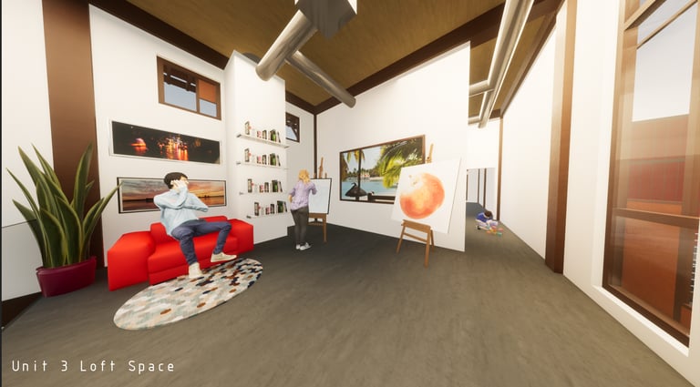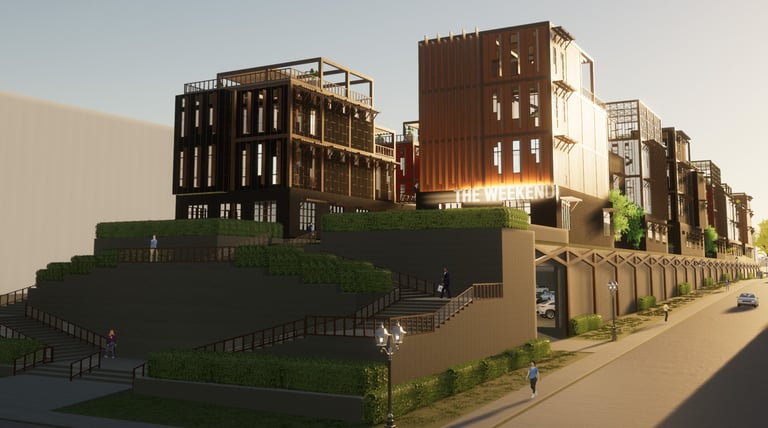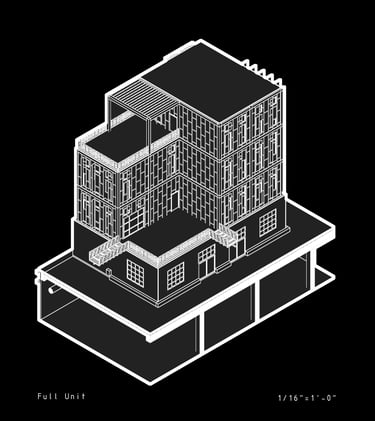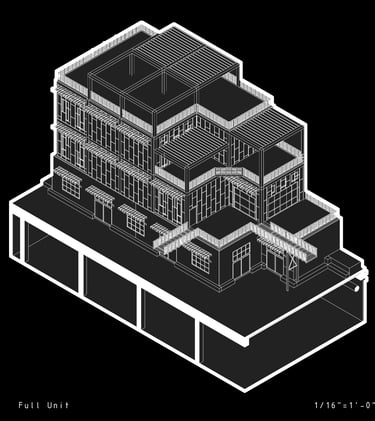 Unit 3 at the Weekend Complex is a distinct unit that appears three times throughout the site. Each of these three units features a different façade and includes both a small and a large rental space. The unit located at the beginning of the site also houses the leasing/rental office. On the residential side, the unit comprises two bedrooms, a half bathroom, a full bathroom, a laundry room, a kitchen, a living room, a large loft space, one rooftop terrace, and a garage/selling space for the tenant. This large unit boasts a very open staircase extending from the second level to the fourth level. With its ample space, it is ideally suited for a creative person who needs a lot of room.