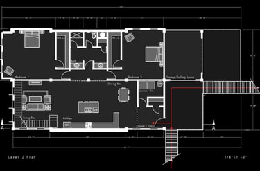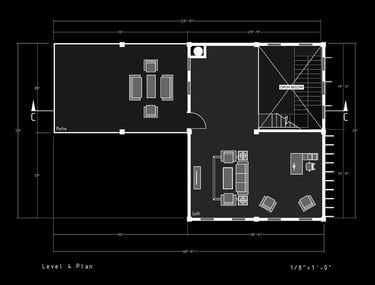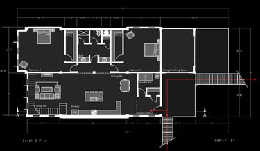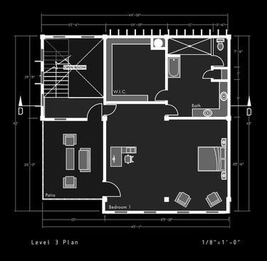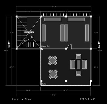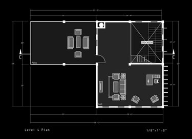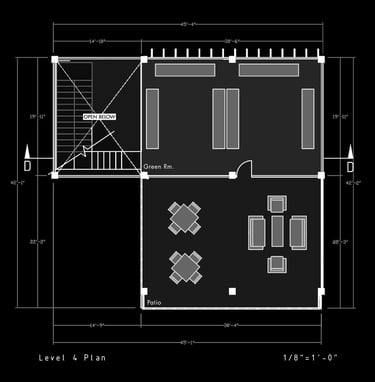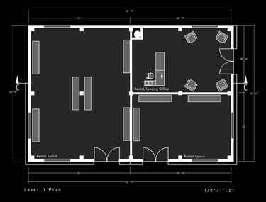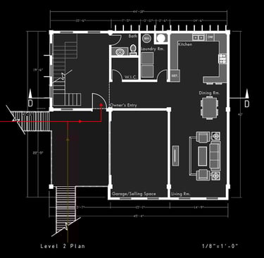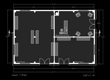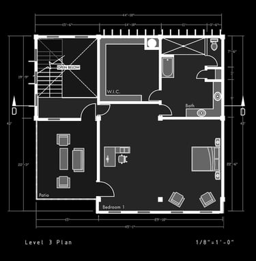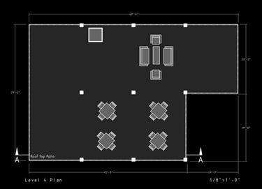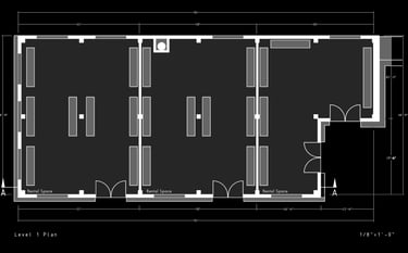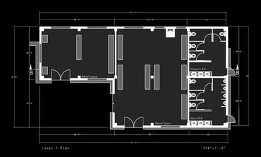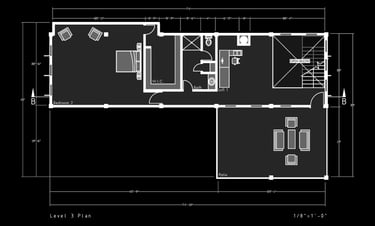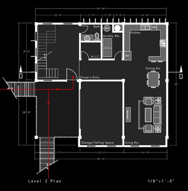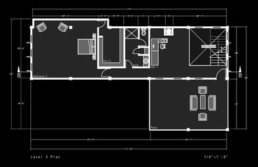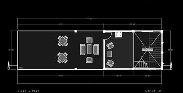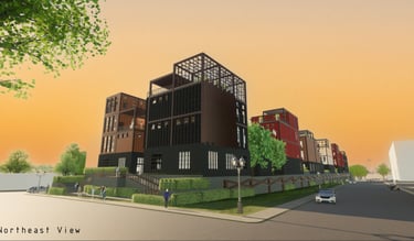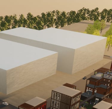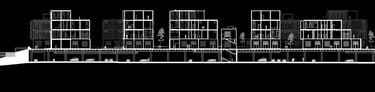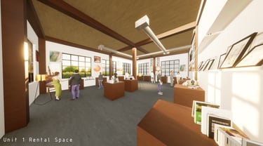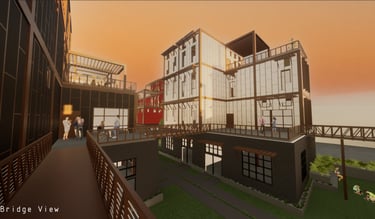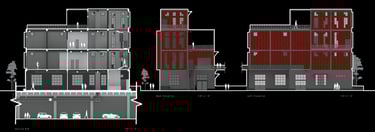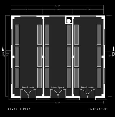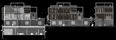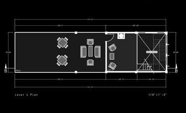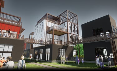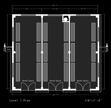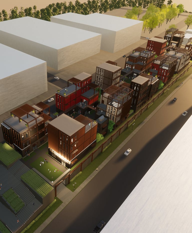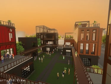 Unit 3 at the Weekend Complex is a distinct unit that appears three times throughout the site. Each of these three units features a different façade and includes both a small and a large rental space. The unit located at the beginning of the site also houses the leasing/rental office. On the residential side, the unit comprises two bedrooms, a half bathroom, a full bathroom, a laundry room, a kitchen, a living room, a large loft space, one rooftop terrace, and a garage/selling space for the tenant. This large unit boasts a very open staircase extending from the second level to the fourth level. With its ample space, it is ideally suited for a creative person who needs a lot of room.