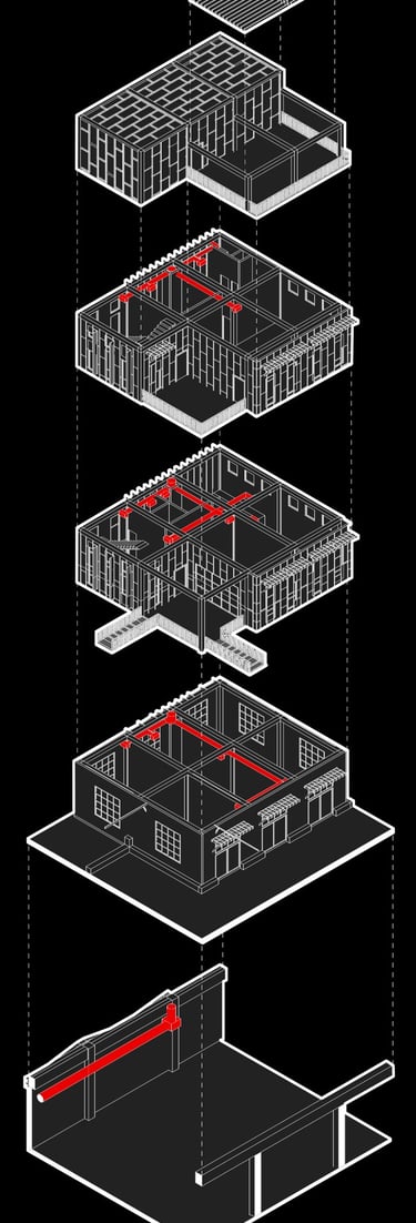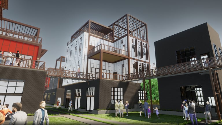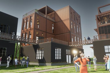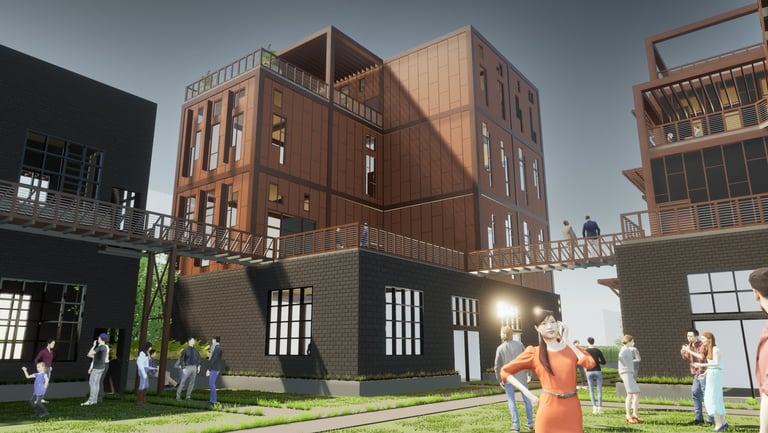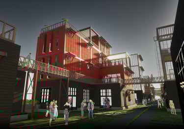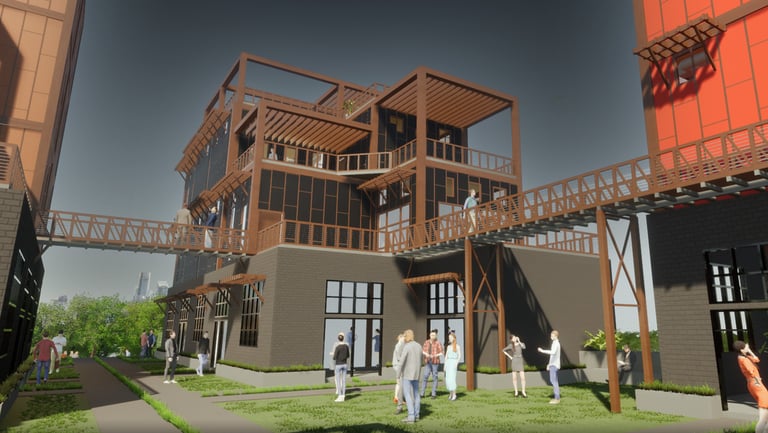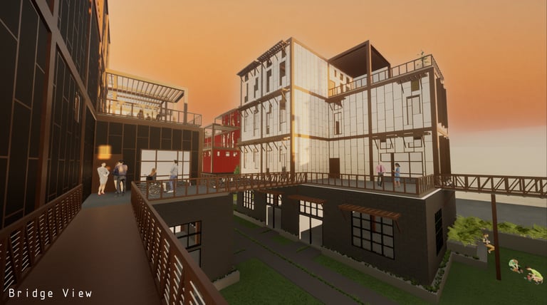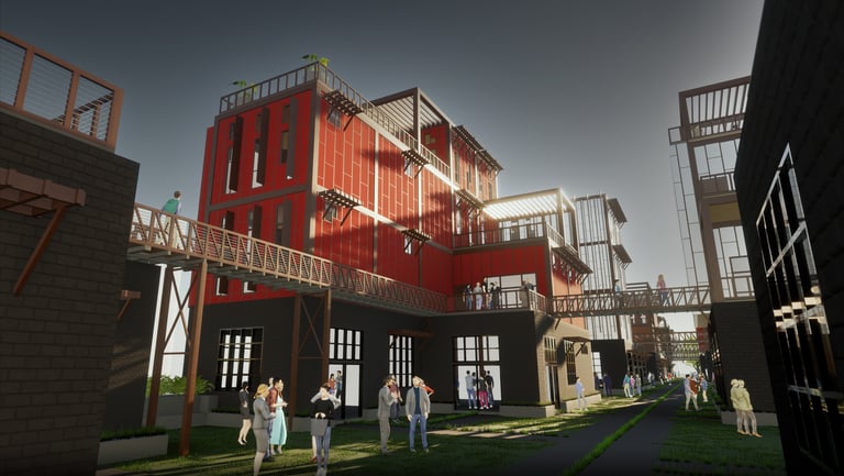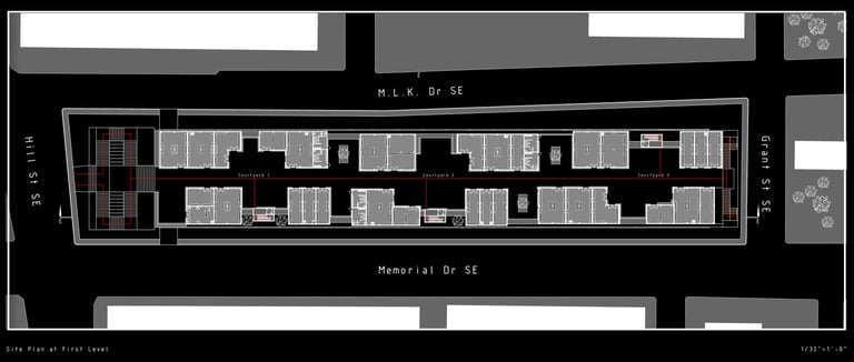As there are a variety of different types of living spaces in Atlanta, The Weekend is unlike any other. Located at 264 Memorial Drive SE, Atlanta, GA 30312, this upcoming project promotes community engagement. Activity at The Weekend primarily occurs on weekends, making it a bustling place with events like flea markets, farmers markets, and reserved gatherings. The development features twelve individual units, comprising rental spaces and residential areas. The ground floor houses a hidden parking garage, accessible by three fire escape stairs. The first level offers forty rentable spaces for public sales. Two main staircases provide street access to this vibrant area. On the residential side, there are four different units. These designs are replicated three times across the site, each with unique facades. Targeting creative individuals who desire ample space, the units offer lofts, rooftop terraces, and greenhouses. Additionally, each residential unit includes a garage/selling space on the second level, allowing tenants to engage with the public and sell their creative works or belongings during the weekends. Public access to these garage spaces is via the three fire escape stairs and a network of sky bridges throughout the site.