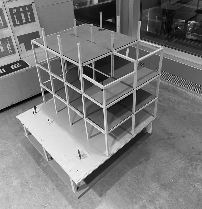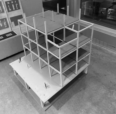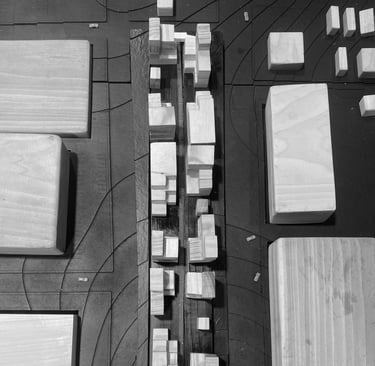 The models created for White's final proposal, The Weekend Complex, included a site model at a scale of 1/32”, which displayed the massings of the twelve individual buildings. There was also a scaled structural model of one of the buildings in Unit 4 at 1’=1-1/2”, along with several additional analysis models.
