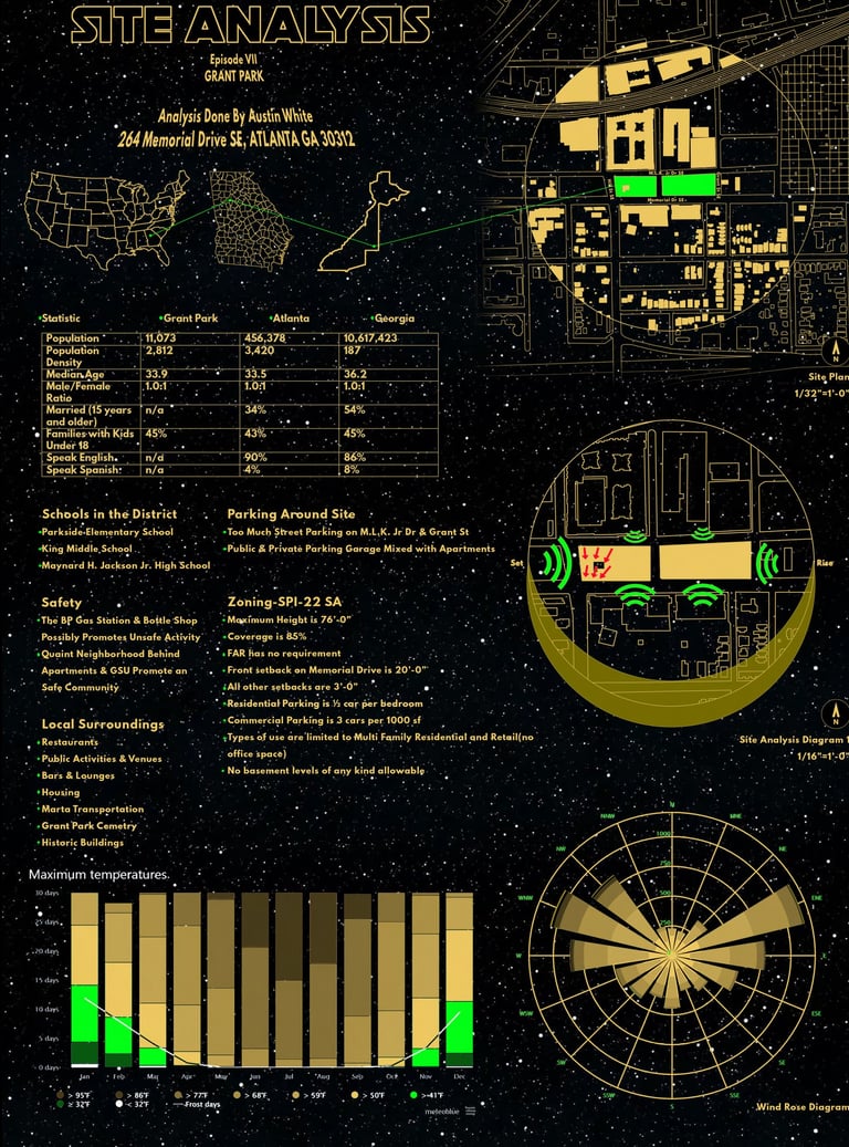 Inspired by the world's most beloved franchise, this site analysis focuses on 264 Memorial Drive SE, Atlanta, GA 30312, for the semester project. The analysis includes a comprehensive study of various aspects such as the surrounding context near the site, noise levels, school districts, parking availability, zoning requirements, temperature variations, and wind patterns. All these factors are thoroughly examined to prepare for the development of the site.