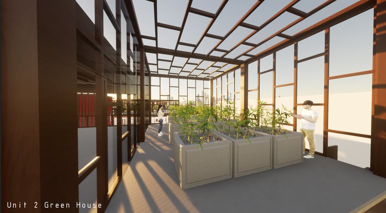 Unit 2 at the Weekend Complex is a unique unit that appears three times throughout the site. Each of these three units has a different façade but shares a common feature: three small rental spaces on the first level. The residential part of the unit includes one bedroom, one half bathroom, one master bathroom, a living room, a kitchen, a laundry room, two rooftop terraces, a green room, and a garage/selling space for the tenant. Although this unit is the smallest among the available units, it is ideal for a couple interested in plant care and requiring ample space.