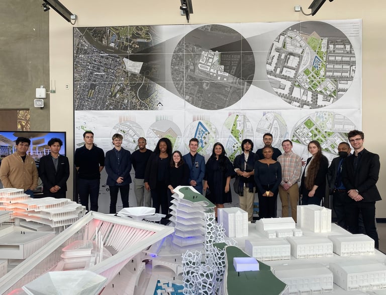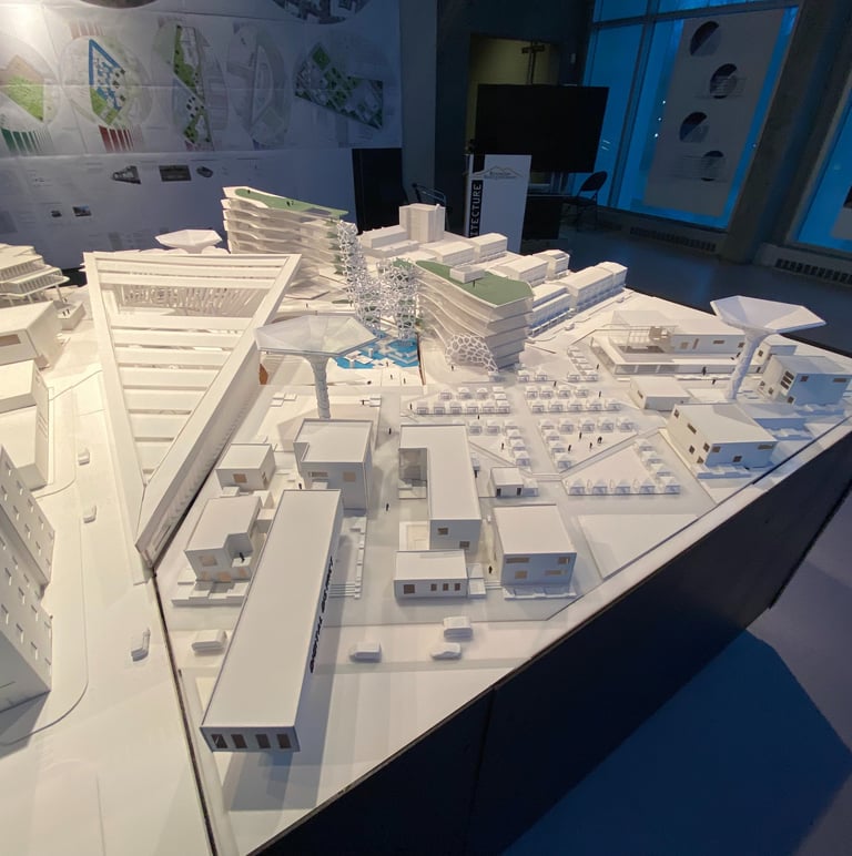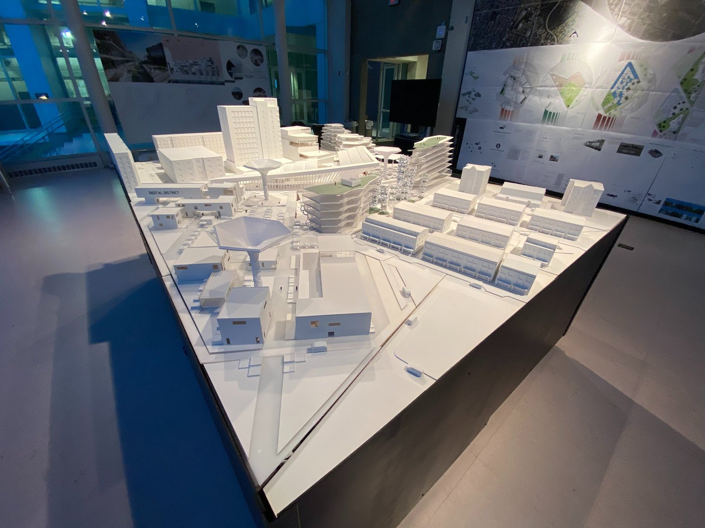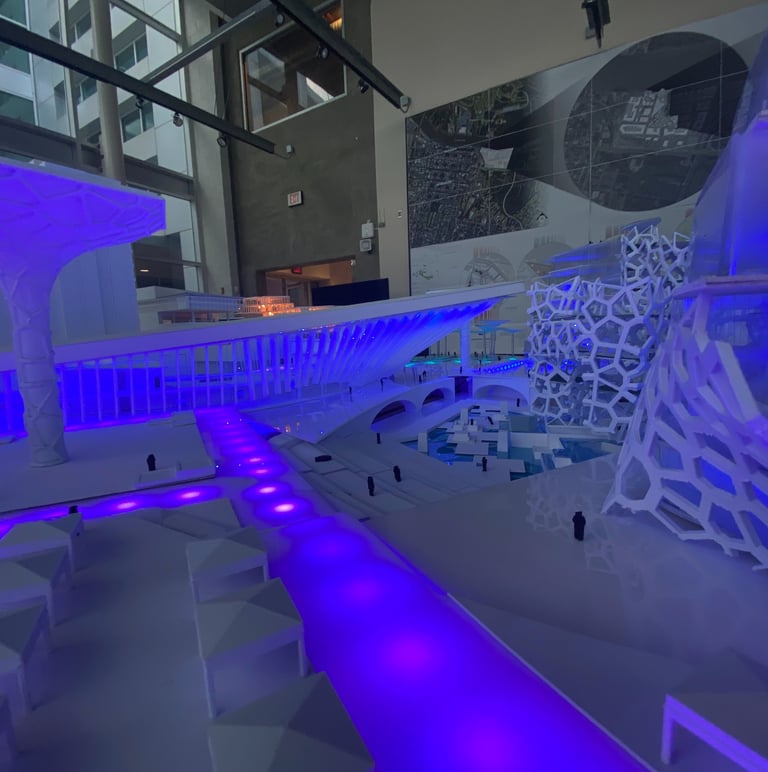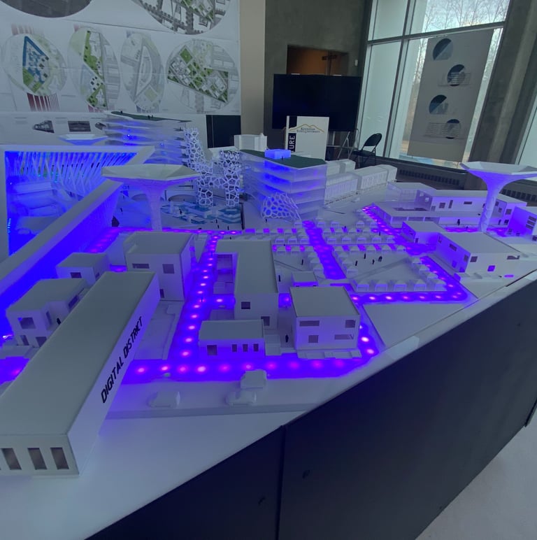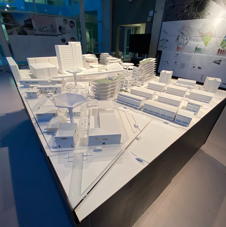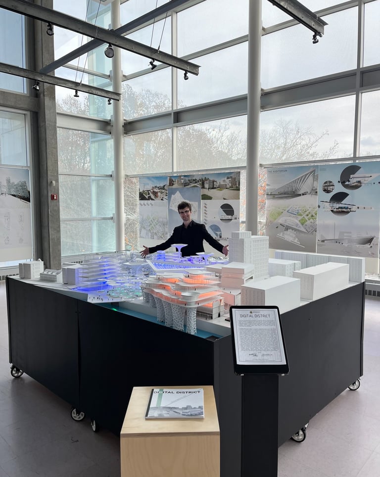 Ultimately, White and his studio team developed a complex named The Digital District. This complex comprises a community center, auditorium, amphitheater, office workshop, and a residential building. It also features innovative elements like autonomous vehicles, underground distribution systems, and drones throughout the site. White and his team integrated the project into the existing area and constructed a 1’=3/16” scale model of the proposed complex design.