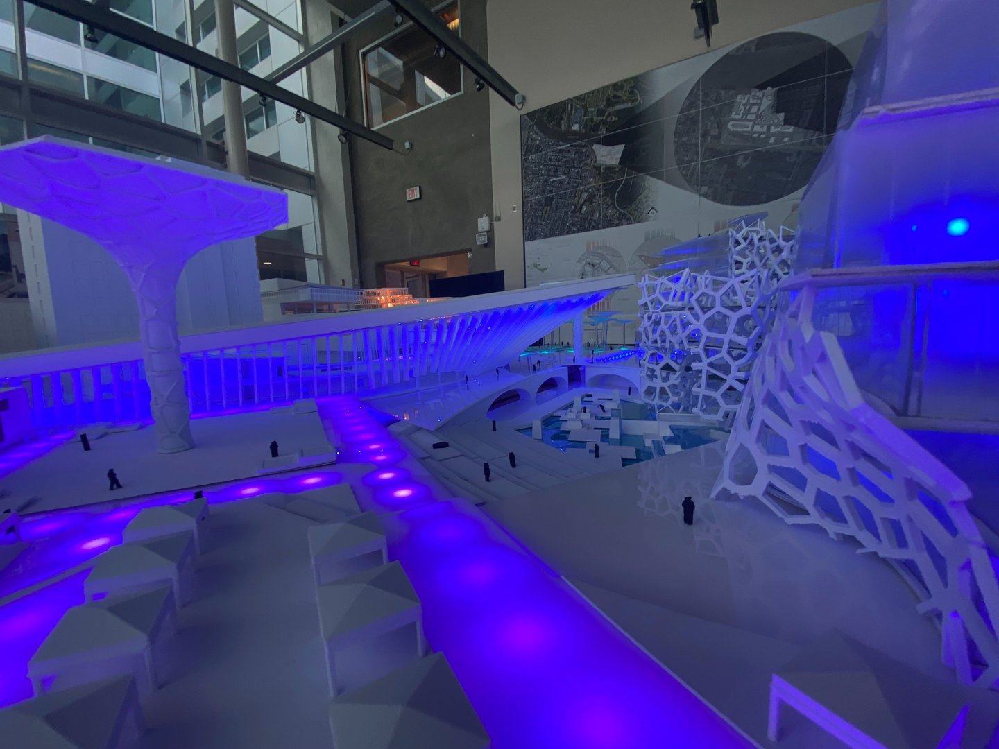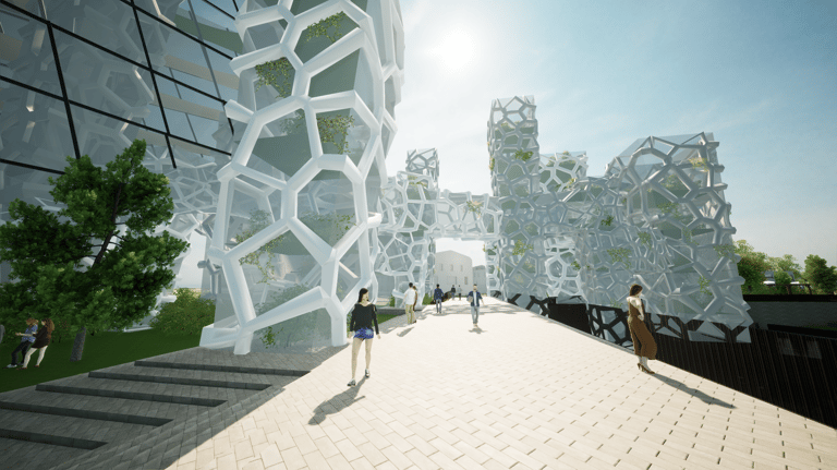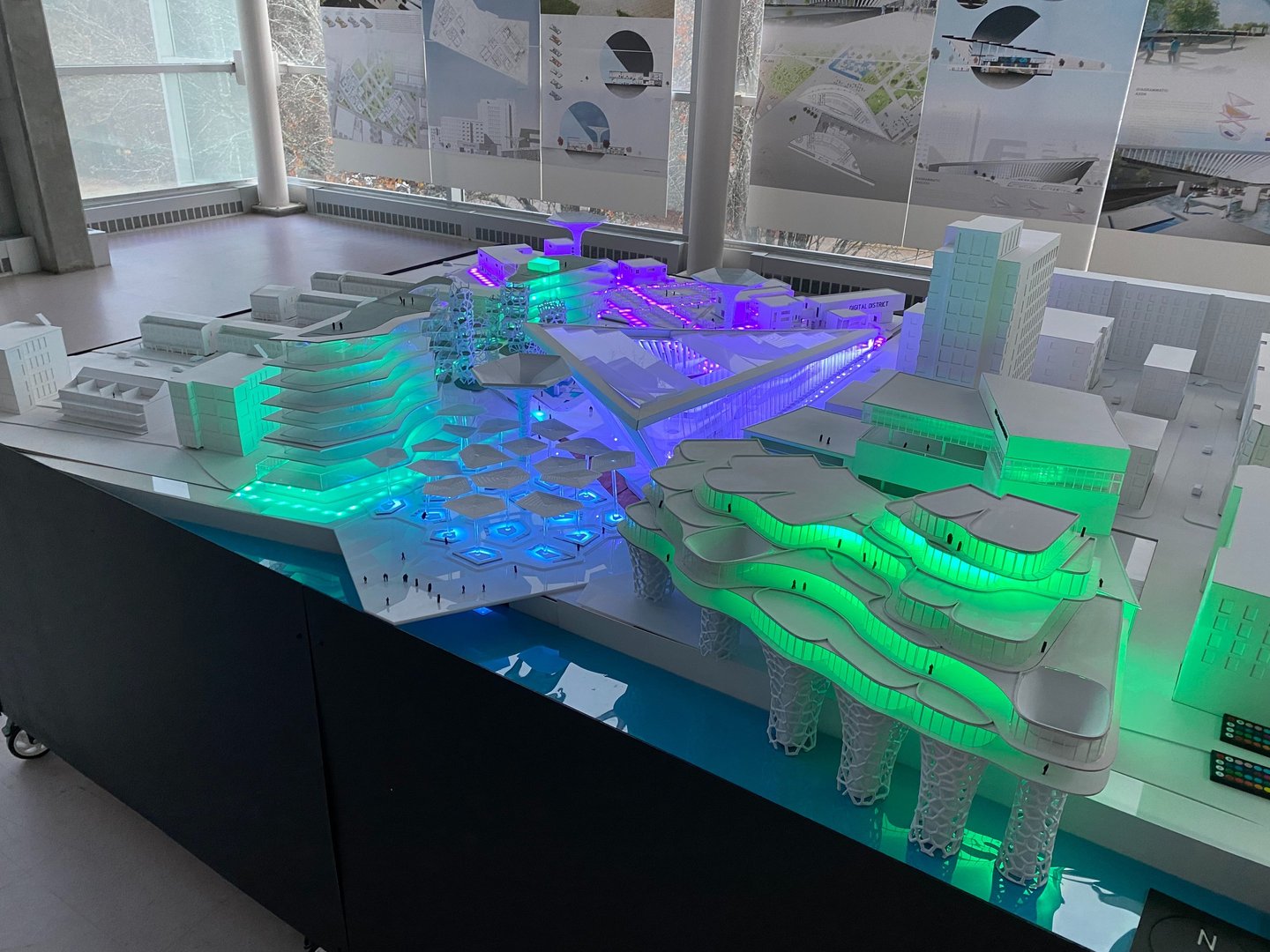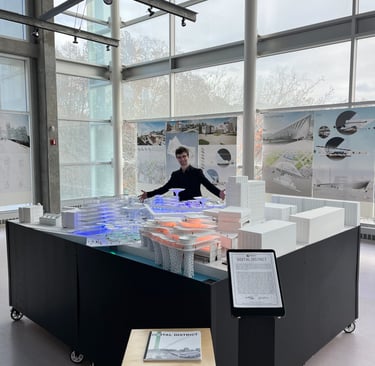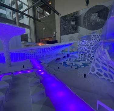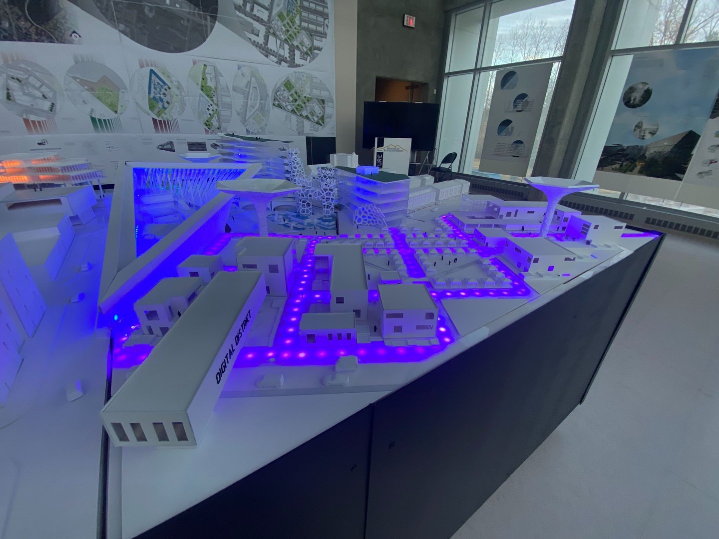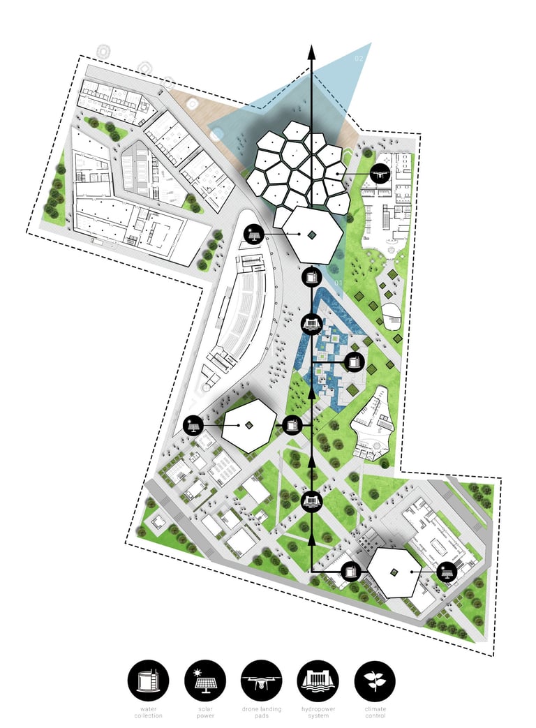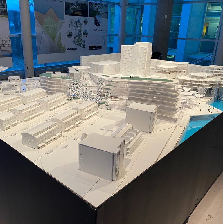 Ultimately, White and his studio team developed a complex named The Digital District. This complex comprises a community center, auditorium, amphitheater, office workshop, and a residential building. It also features innovative elements like autonomous vehicles, underground distribution systems, and drones throughout the site. White and his team integrated the project into the existing area and constructed a 1’=3/16” scale model of the proposed complex design.