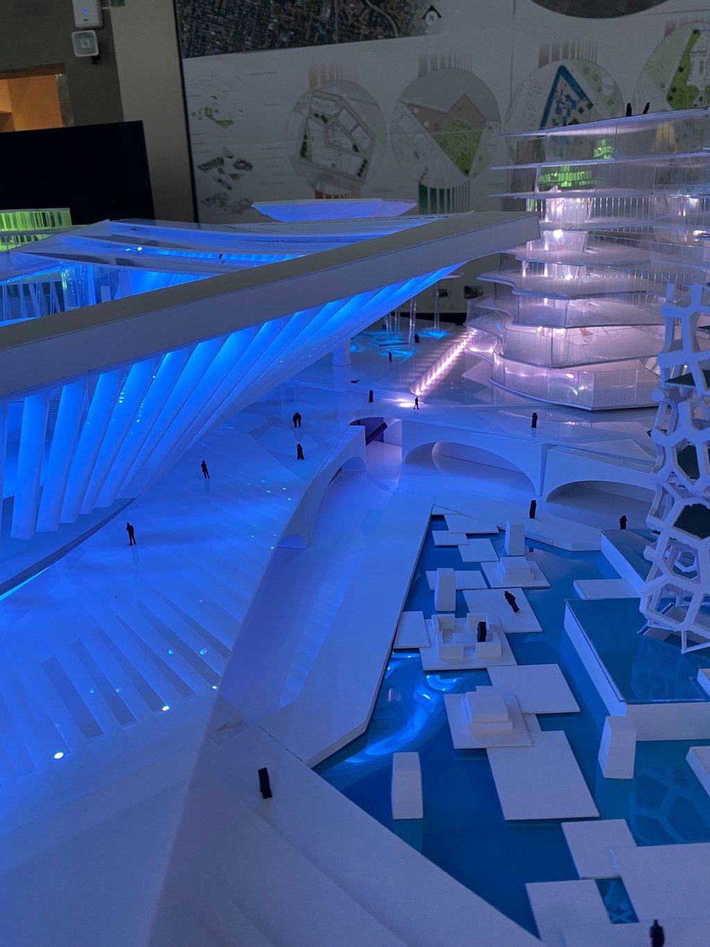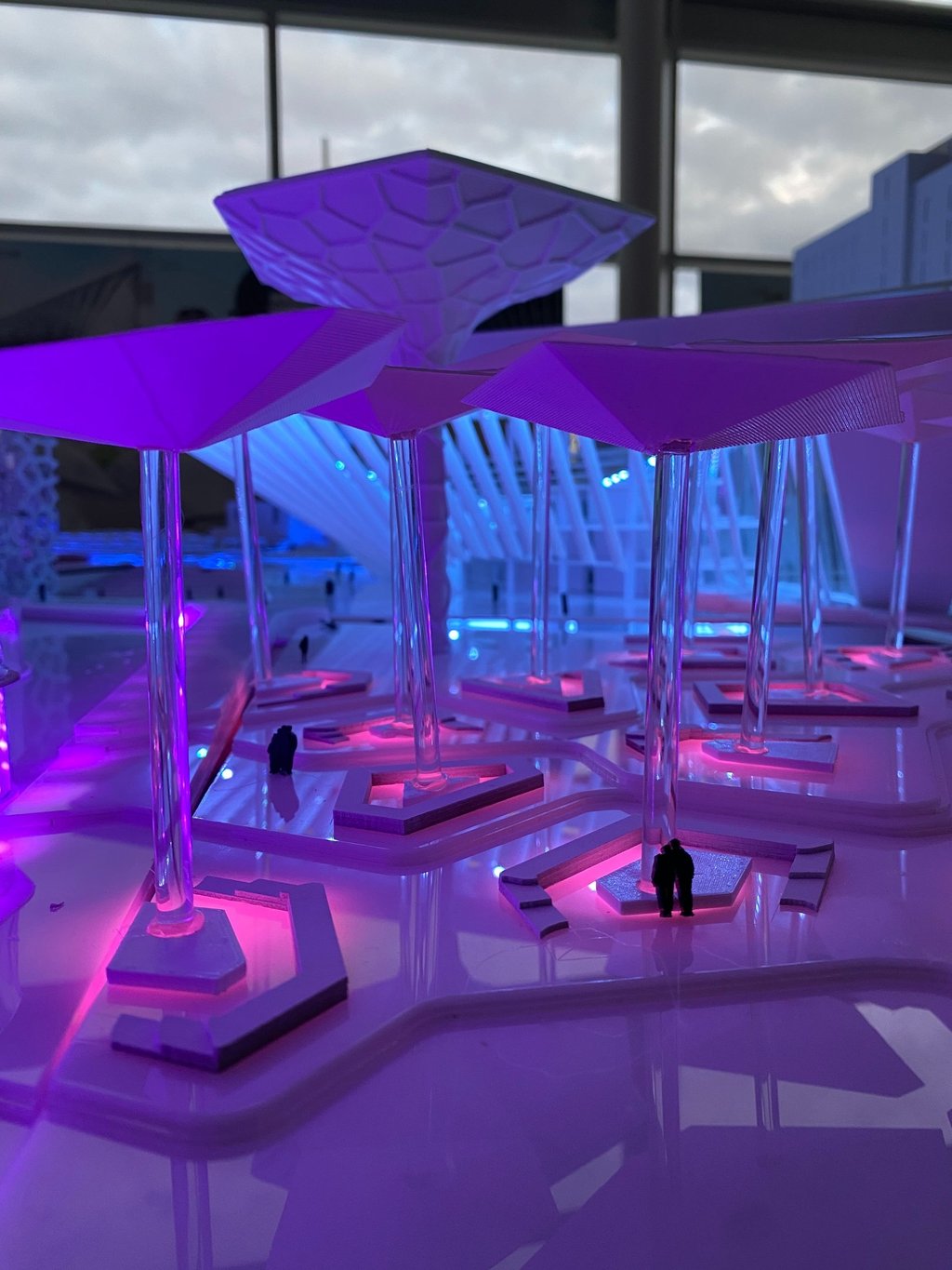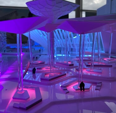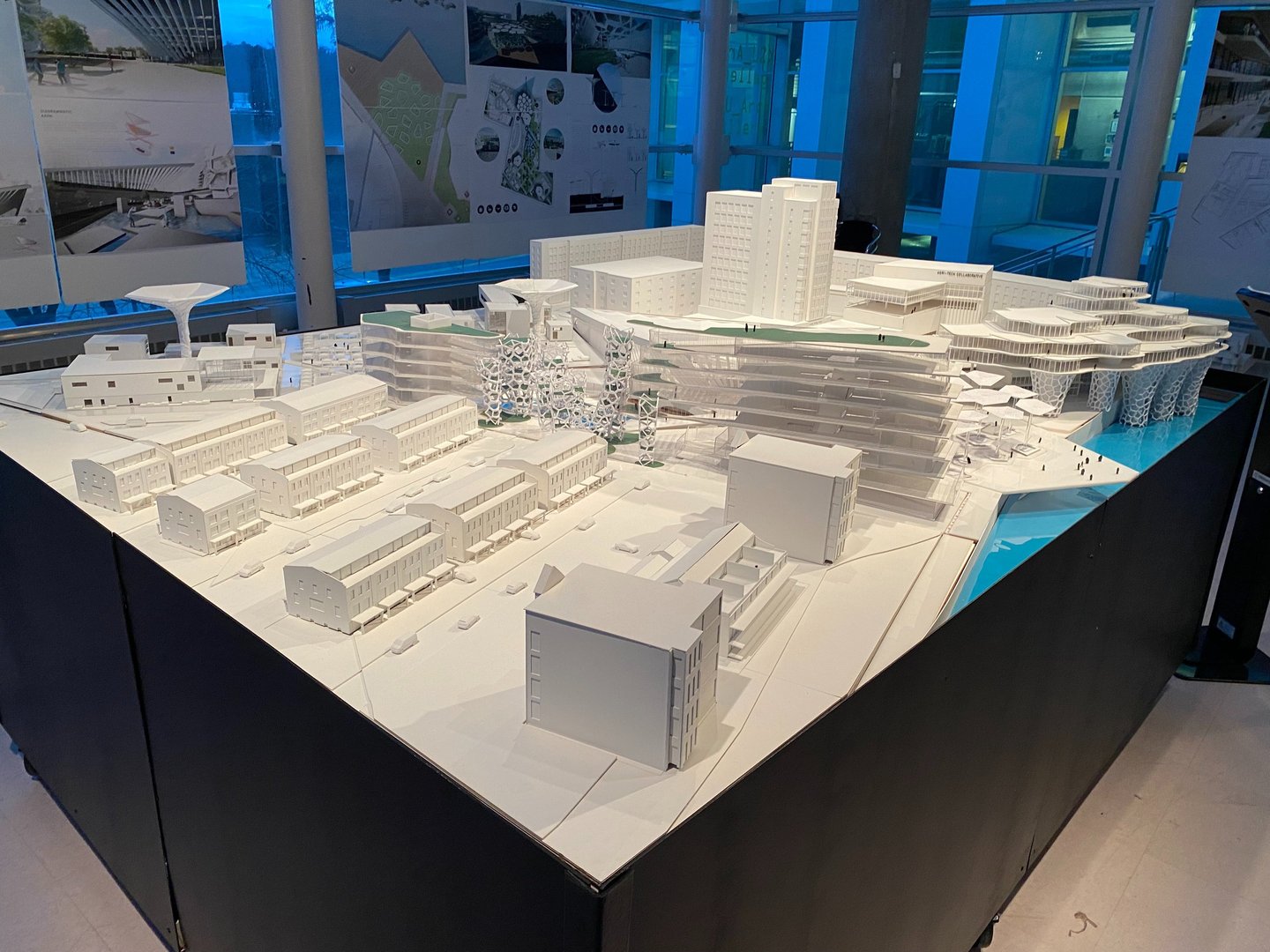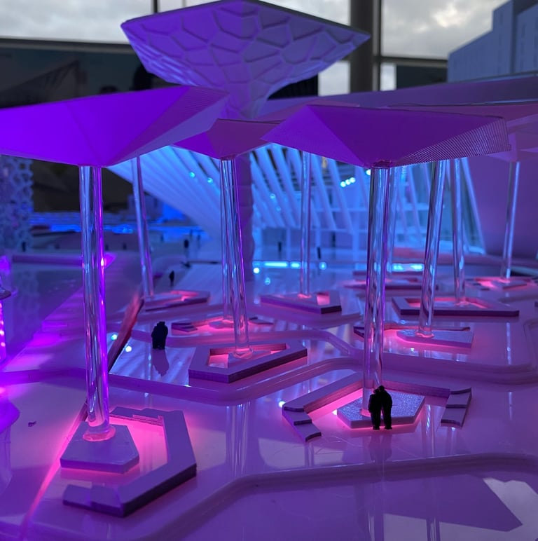 Ultimately, White and his studio team developed a complex named The Digital District. This complex comprises a community center, auditorium, amphitheater, office workshop, and a residential building. It also features innovative elements like autonomous vehicles, underground distribution systems, and drones throughout the site. White and his team integrated the project into the existing area and constructed a 1’=3/16” scale model of the proposed complex design.