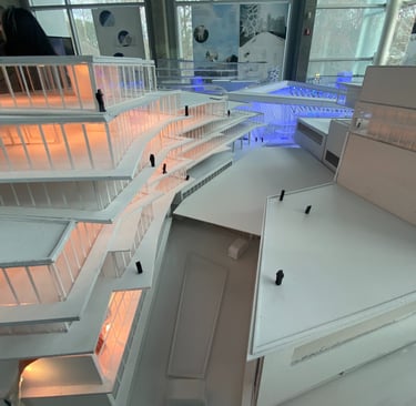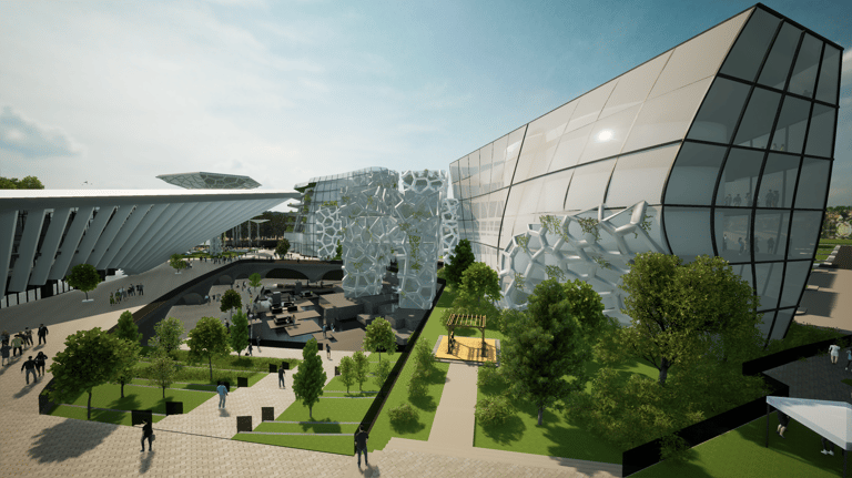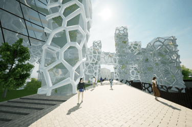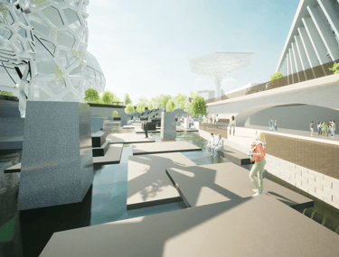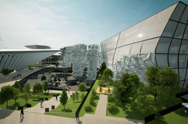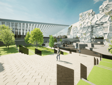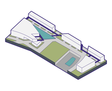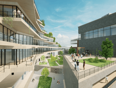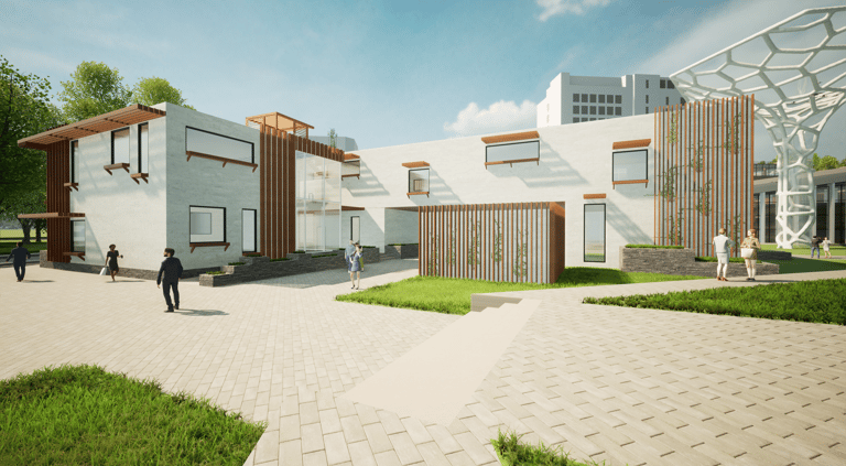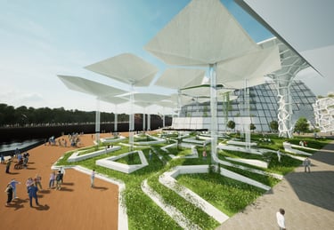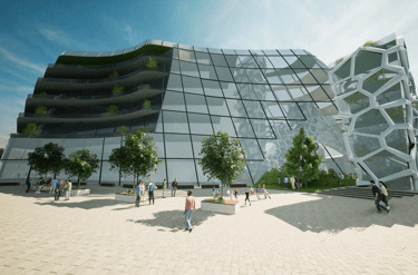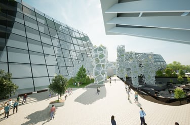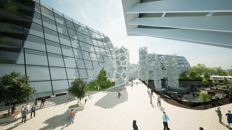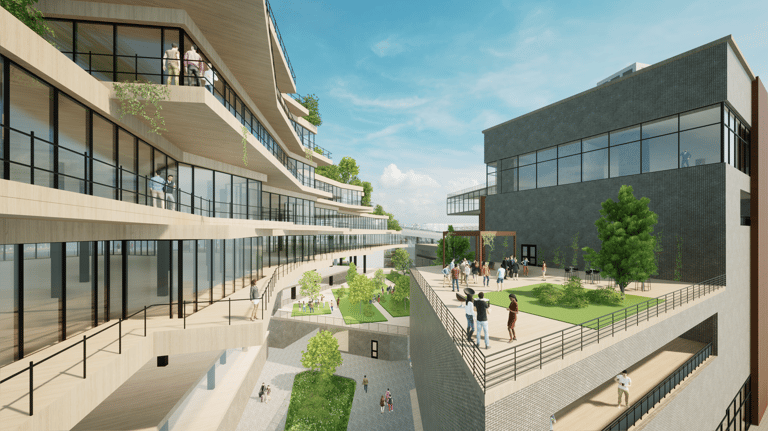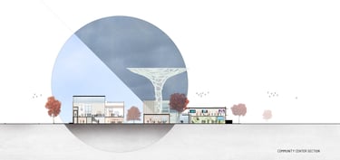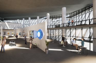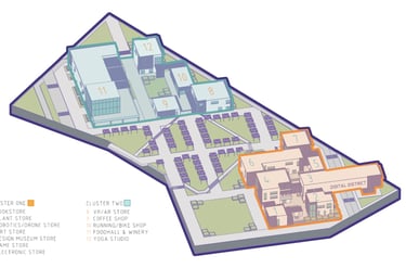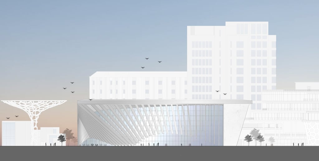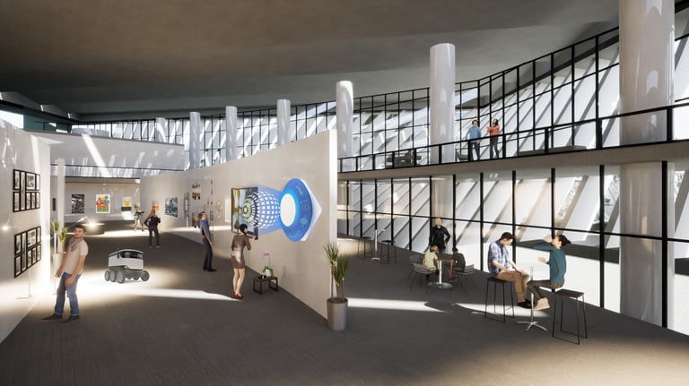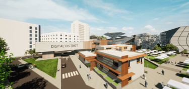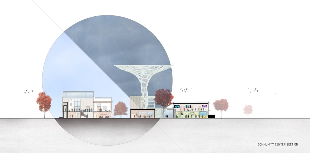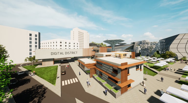The Community Center at the Digital District offers a dynamic environment with a variety of engaging spaces. The center's aim is to provide an indoor and outdoor experience that encourages visitors to stay and explore. Across twelve different buildings, guests can find interactive spaces focused on innovation and well-being. The innovation aspect of the Community Center includes programs related to robotics, drones, VR/AR, electronics, video games, and design knick-knacks. In contrast, the well-being section emphasizes activities like integrating plants, running, biking, yoga, art, books, and coffee. Each interactive space features a retail shop where visitors can purchase innovative or well-being products or services, and also learn more about them. Additionally, the Community Center boasts a large food hall and winery, which serve as central gathering spots in the Digital District, uniting the community through food, drinks, and social spaces.