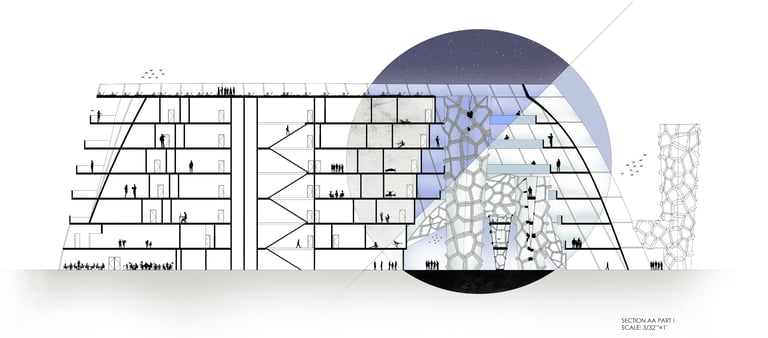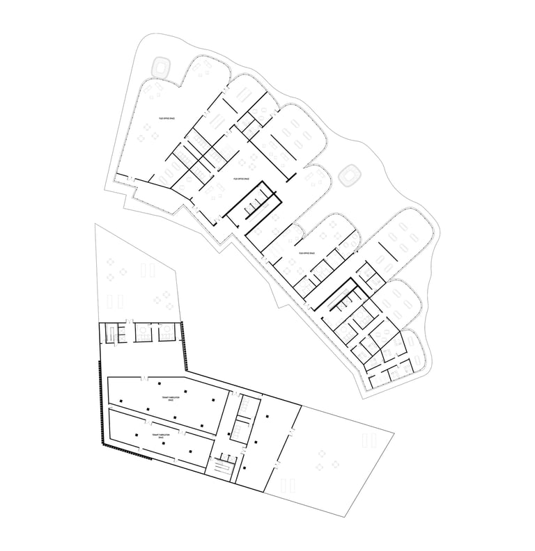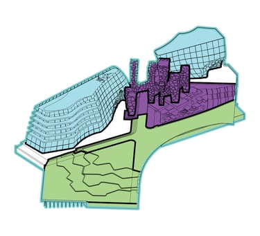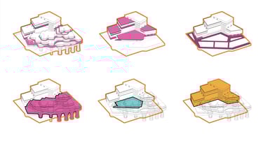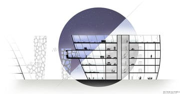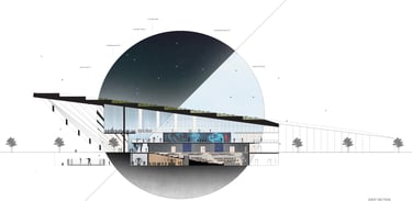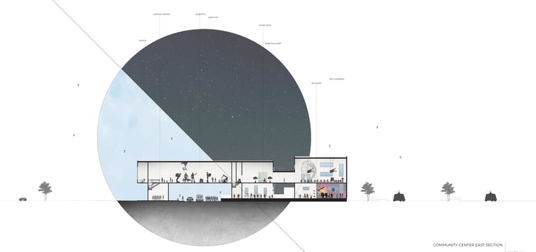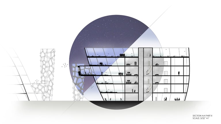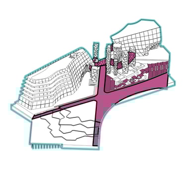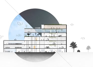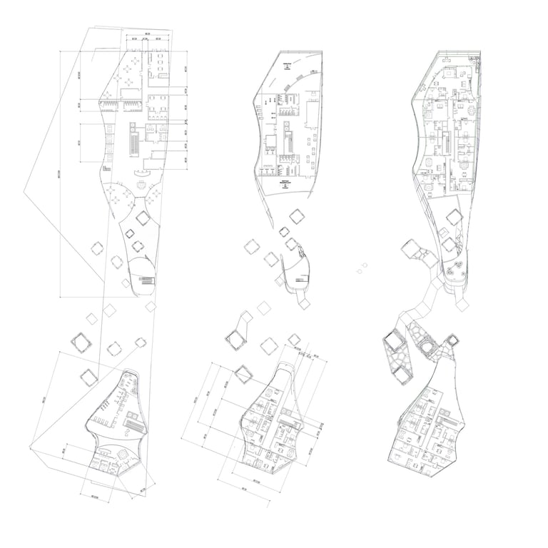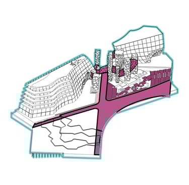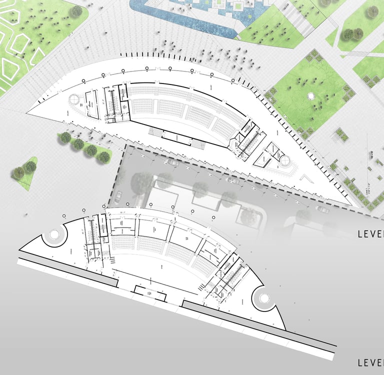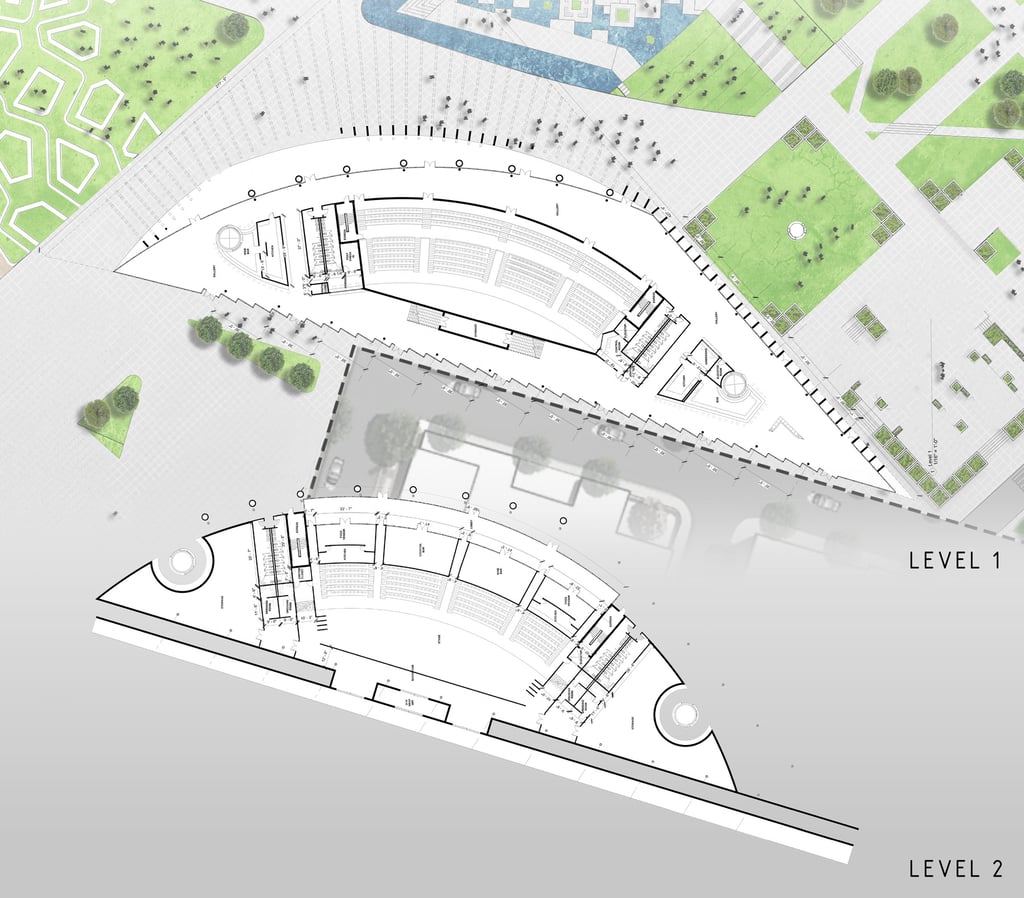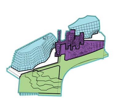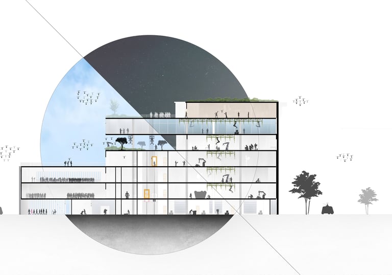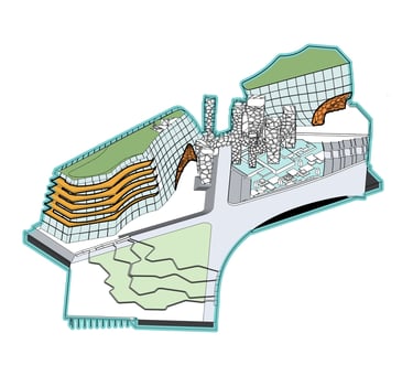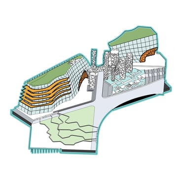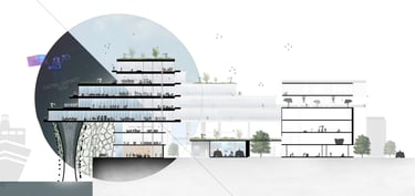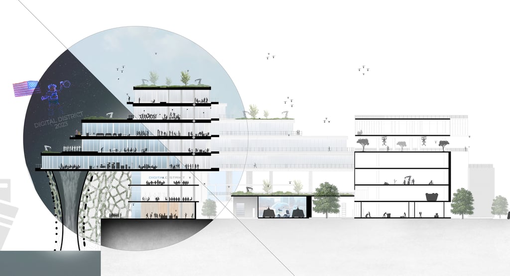 The Office-Workshop at the Digital District, positioned as the most secluded and enclosed part of the site, functioned as the center for work, research, and technology development. It catered to four distinct types of companies, in line with the specific needs of Curiosity Labs as a facilitator. These companies specialized in areas such as agricultural drones for crop harvesting, autonomous vehicle systems, hydroponic farming, and waste recycling of plant matter. Each company was provided with designated spaces for fabrication, offices, hydroponic labs, and a raised courtyard that served as a testing zone for their specialized fields. The fabrication area, a monolithic structure, featured expansive floors to accommodate a wide range of specialized electronics and mechanics, essential for production and testing. The lower section housed a spacious mechanical bay for the development, testing, and repair of autonomous vehicles. The office spaces were ingeniously designed with a two-tiered approach: the lower level offered coworking spaces for temporary, short-term collaborations, while the upper levels provided long-term leasable spaces for companies. A significant portion of the upper level was dedicated to a generously sized social space, offering panoramic views of the amphitheater.