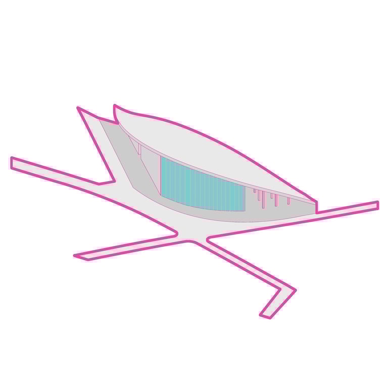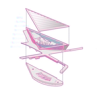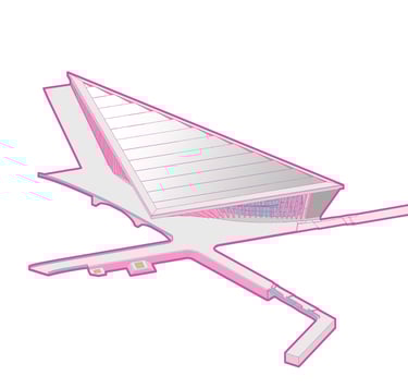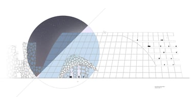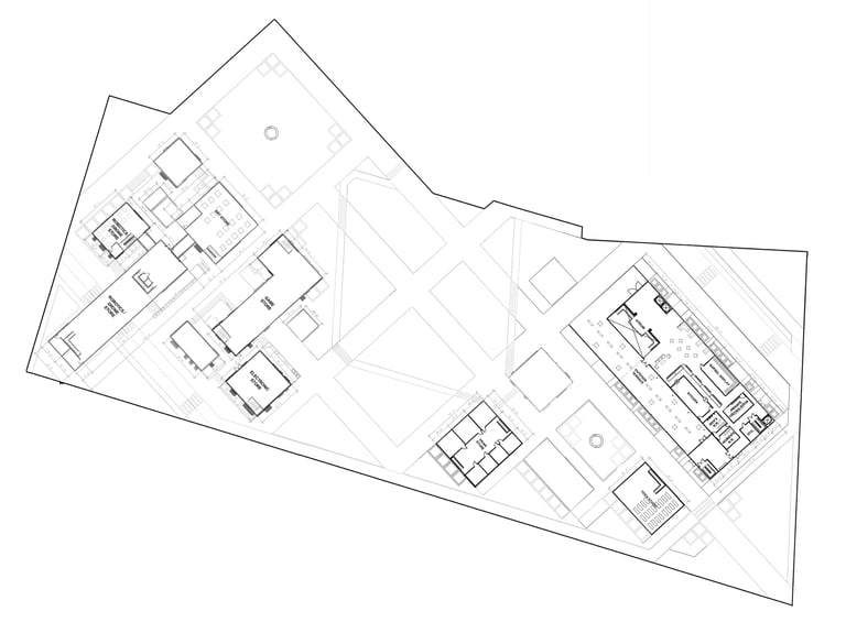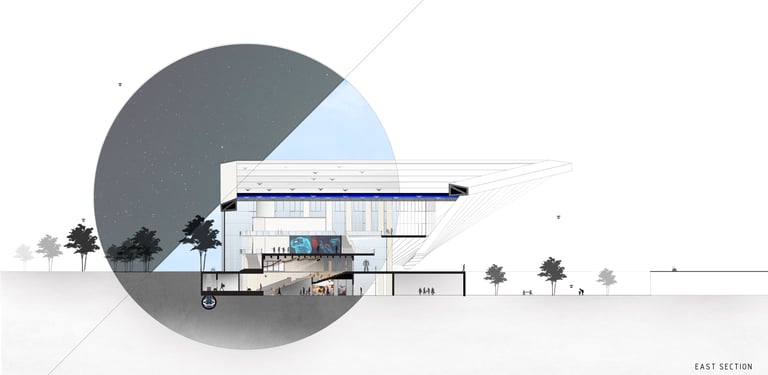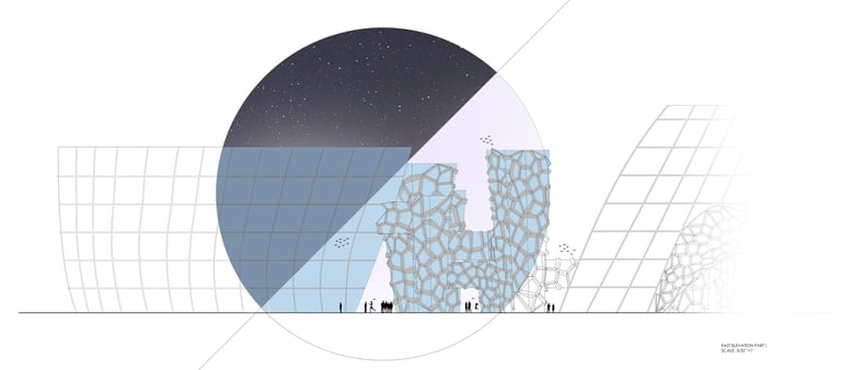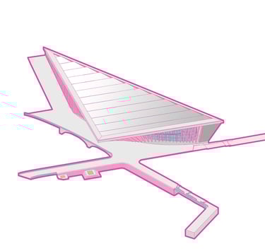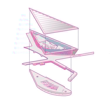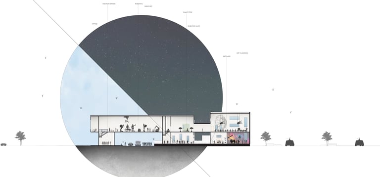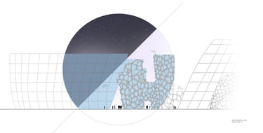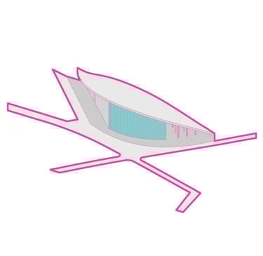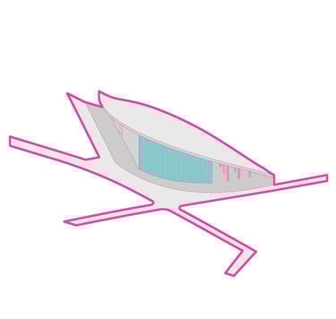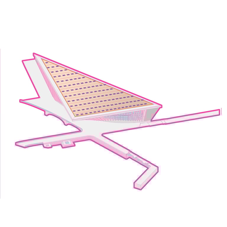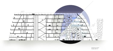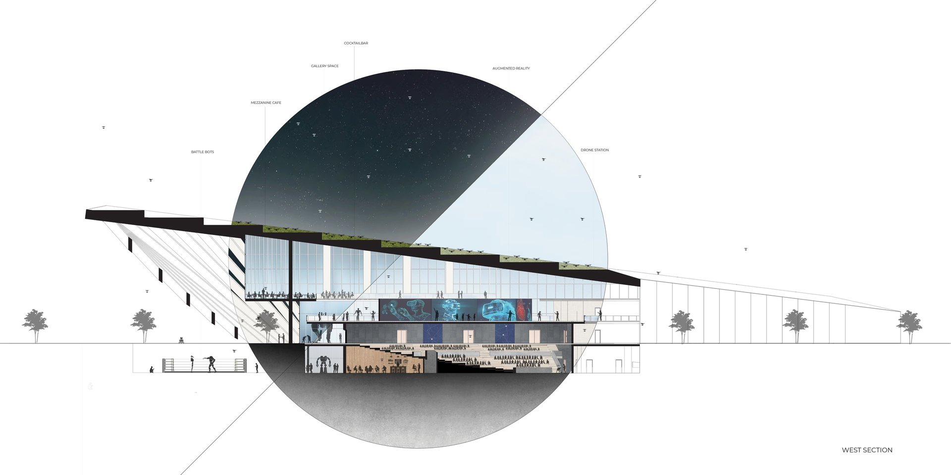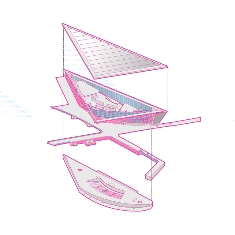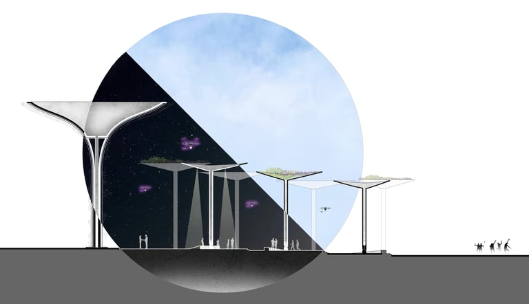 The Office-Workshop at the Digital District, positioned as the most secluded and enclosed part of the site, functioned as the center for work, research, and technology development. It catered to four distinct types of companies, in line with the specific needs of Curiosity Labs as a facilitator. These companies specialized in areas such as agricultural drones for crop harvesting, autonomous vehicle systems, hydroponic farming, and waste recycling of plant matter. Each company was provided with designated spaces for fabrication, offices, hydroponic labs, and a raised courtyard that served as a testing zone for their specialized fields. The fabrication area, a monolithic structure, featured expansive floors to accommodate a wide range of specialized electronics and mechanics, essential for production and testing. The lower section housed a spacious mechanical bay for the development, testing, and repair of autonomous vehicles. The office spaces were ingeniously designed with a two-tiered approach: the lower level offered coworking spaces for temporary, short-term collaborations, while the upper levels provided long-term leasable spaces for companies. A significant portion of the upper level was dedicated to a generously sized social space, offering panoramic views of the amphitheater.