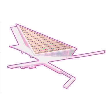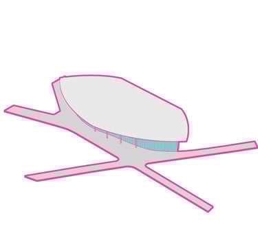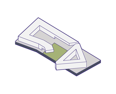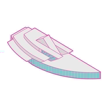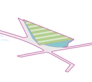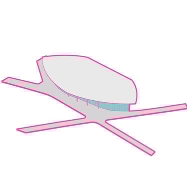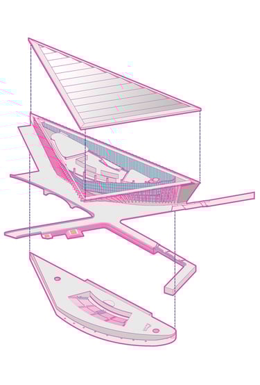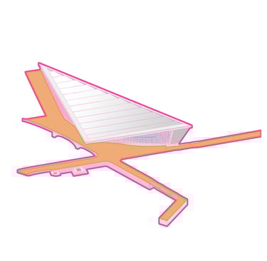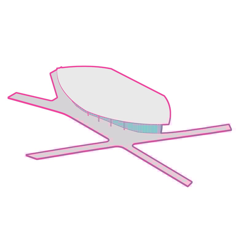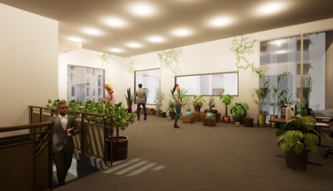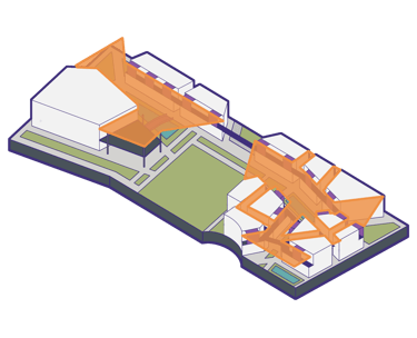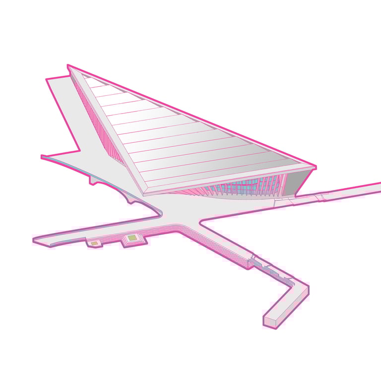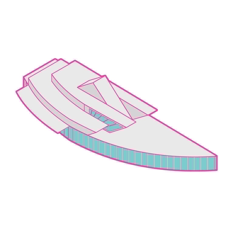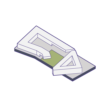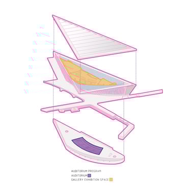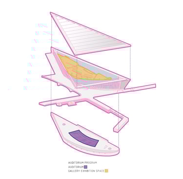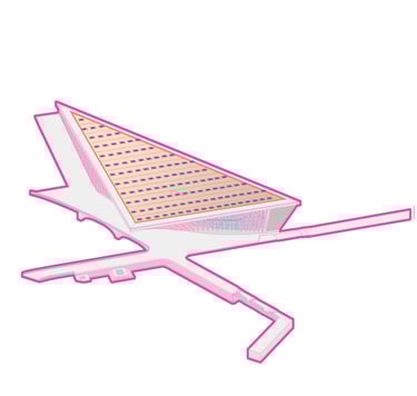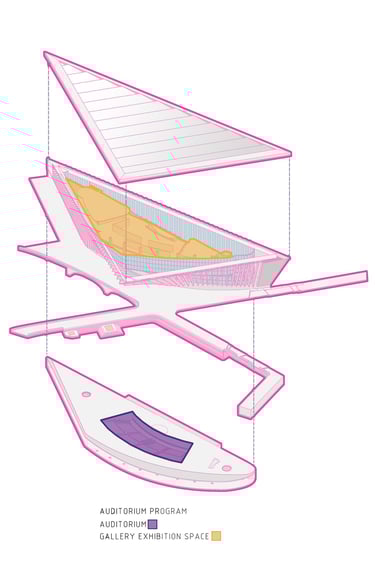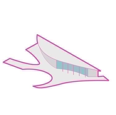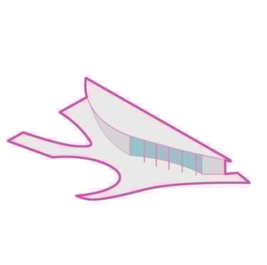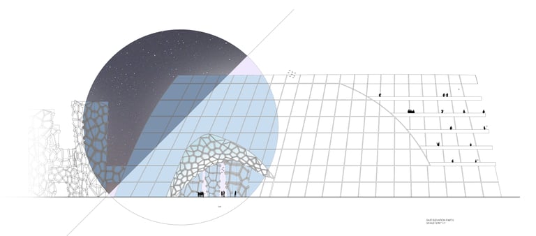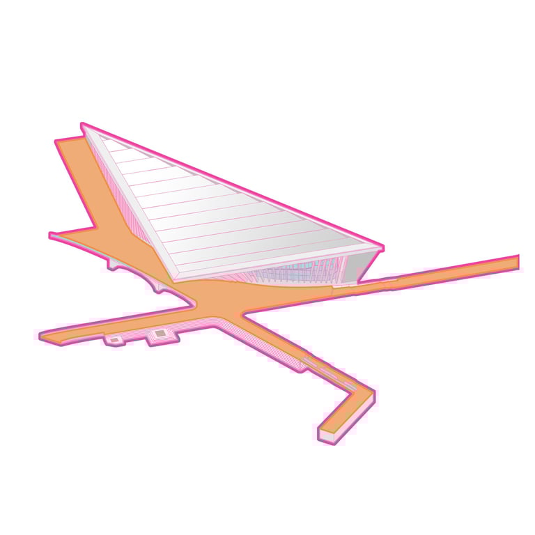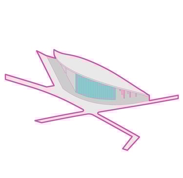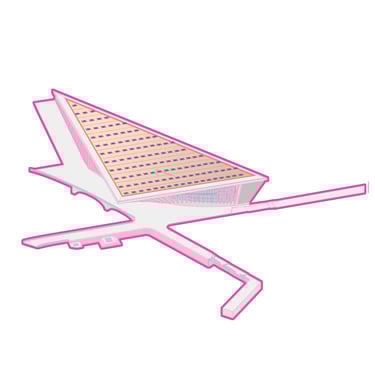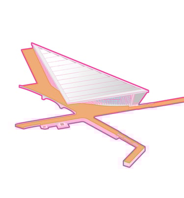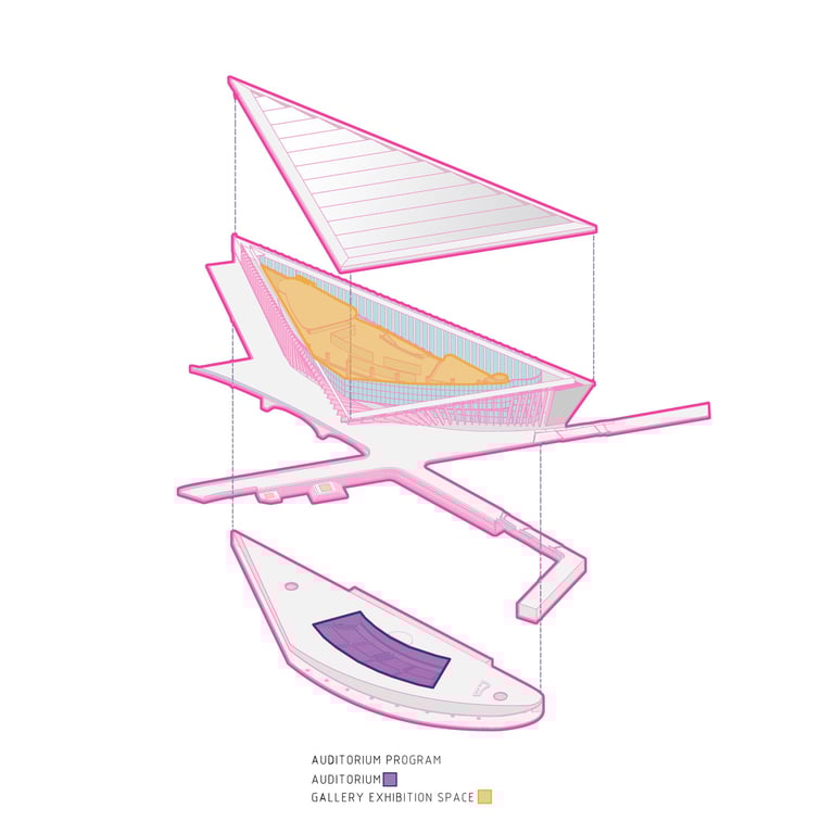 The Office-Workshop at the Digital District, positioned as the most secluded and enclosed part of the site, functioned as the center for work, research, and technology development. It catered to four distinct types of companies, in line with the specific needs of Curiosity Labs as a facilitator. These companies specialized in areas such as agricultural drones for crop harvesting, autonomous vehicle systems, hydroponic farming, and waste recycling of plant matter. Each company was provided with designated spaces for fabrication, offices, hydroponic labs, and a raised courtyard that served as a testing zone for their specialized fields. The fabrication area, a monolithic structure, featured expansive floors to accommodate a wide range of specialized electronics and mechanics, essential for production and testing. The lower section housed a spacious mechanical bay for the development, testing, and repair of autonomous vehicles. The office spaces were ingeniously designed with a two-tiered approach: the lower level offered coworking spaces for temporary, short-term collaborations, while the upper levels provided long-term leasable spaces for companies. A significant portion of the upper level was dedicated to a generously sized social space, offering panoramic views of the amphitheater.