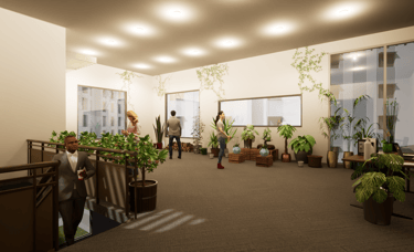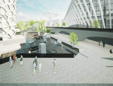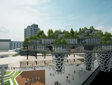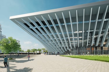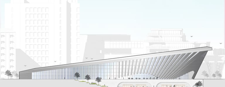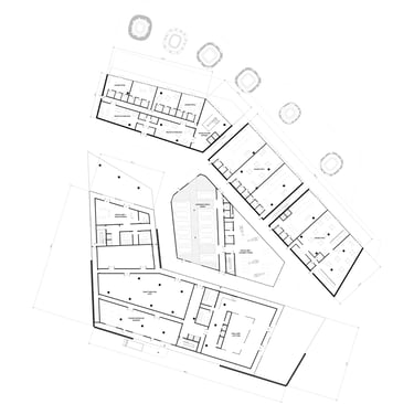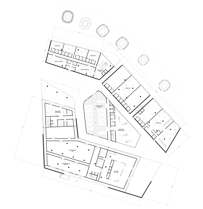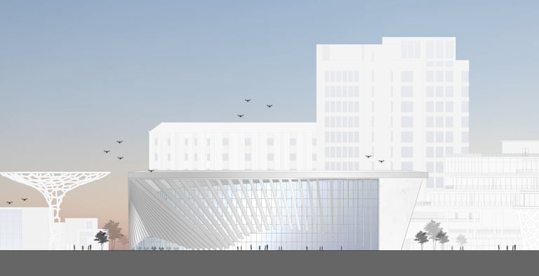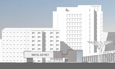 The Residential Building in the Digital District is a prominent feature on the site, offering a blend of public and private programs on its lower floors for both visitors and residents. The public program encompasses sociable spaces such as restaurants and cafes, designed to attract pedestrians from the existing residential areas outside the site. In contrast, the private program includes amenities specifically for the building's residents, such as a gym, lounges, and leasing office space.