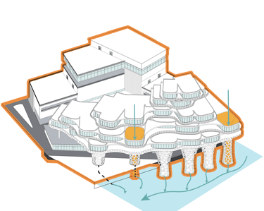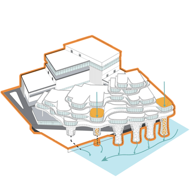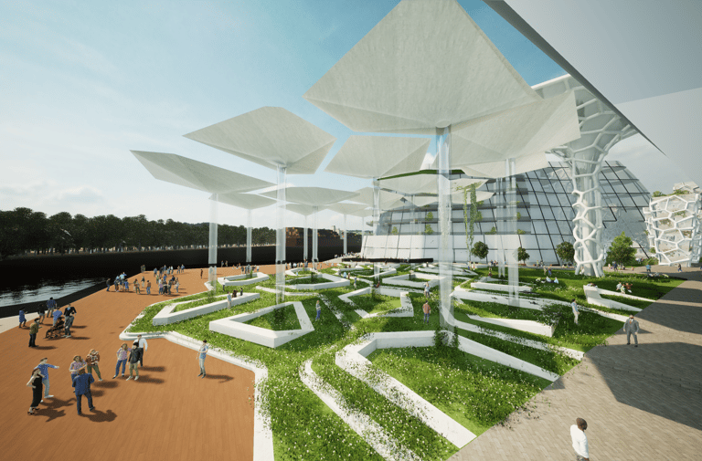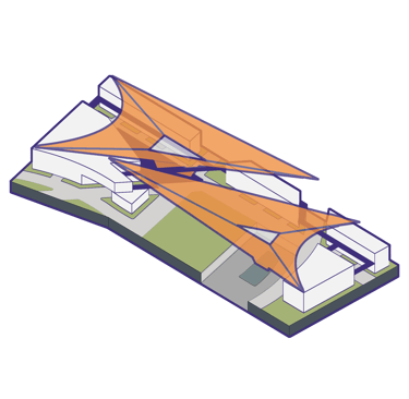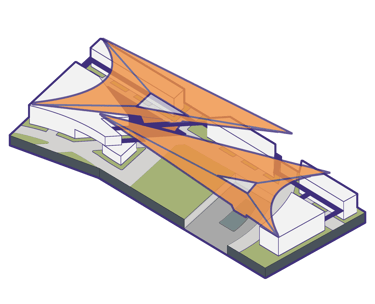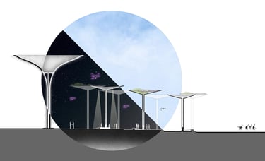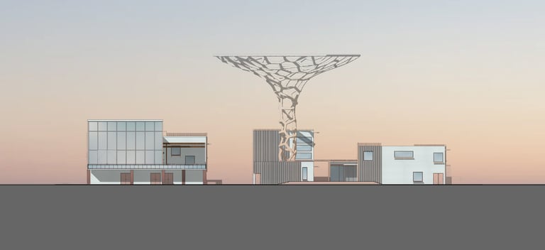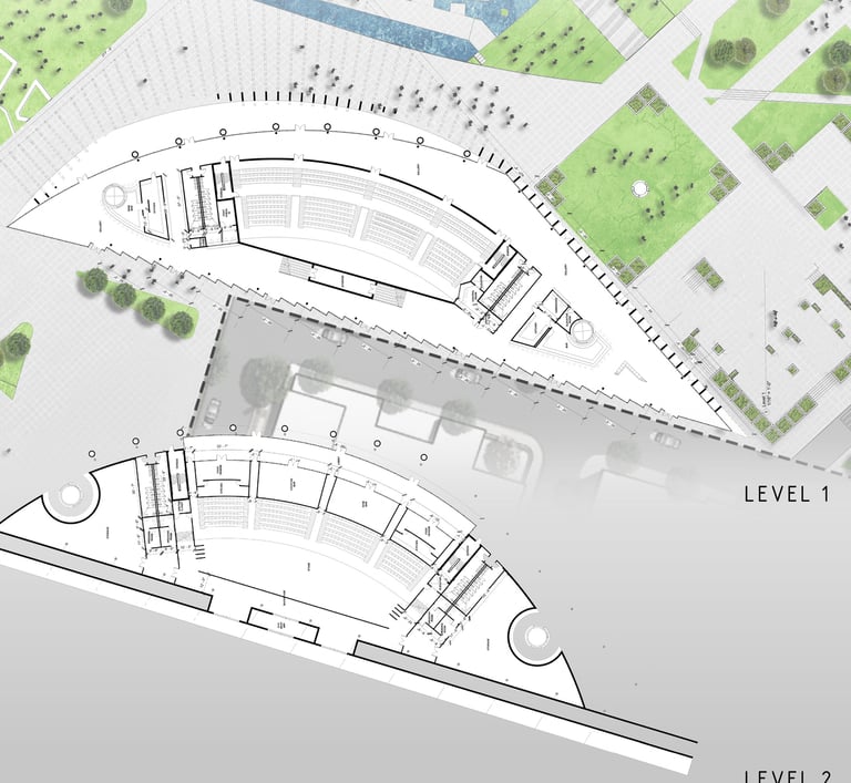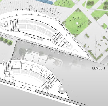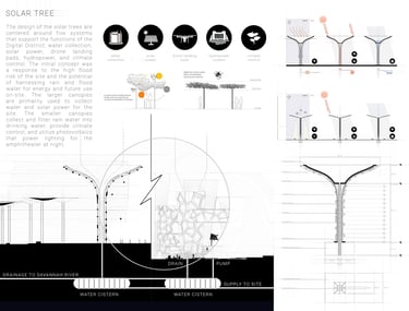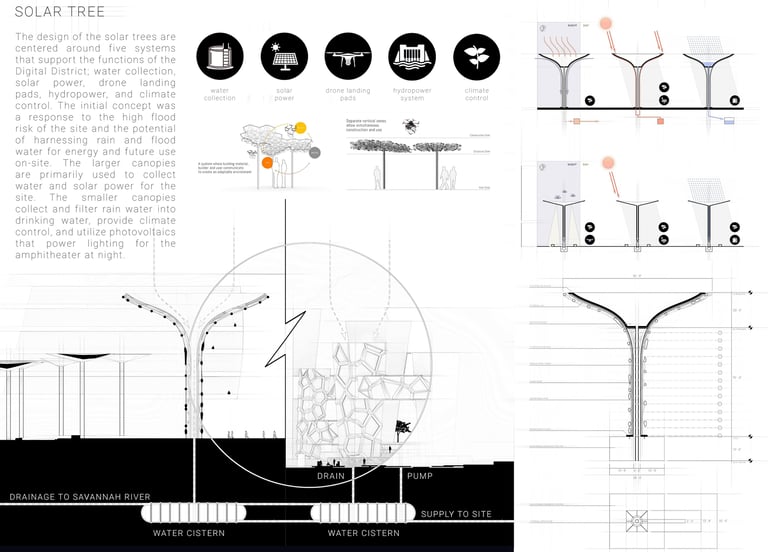 The amphitheater at the Digital District offers a distinctive gathering space for the community to enjoy live performances while overlooking the riverfront. It is designed with pedestrian accessibility and circulation as a priority, extending the existing riverwalk onto the site and around the amphitheater to facilitate a welcoming approach from all directions. The solar tree concept was developed to provide climate control and manage water entering the site, whether from rain or storm surges. Focusing on scenic viewpoints, urban engagement, placemaking, and climate considerations, this program positions the Digital District as a pivotal and defining feature at the end of the Savannah Riverwalk. Additionally, as the Amphitheater develops the common space for the community the application of this area extends into of common areas connecting the all the programs of the Digital District together.