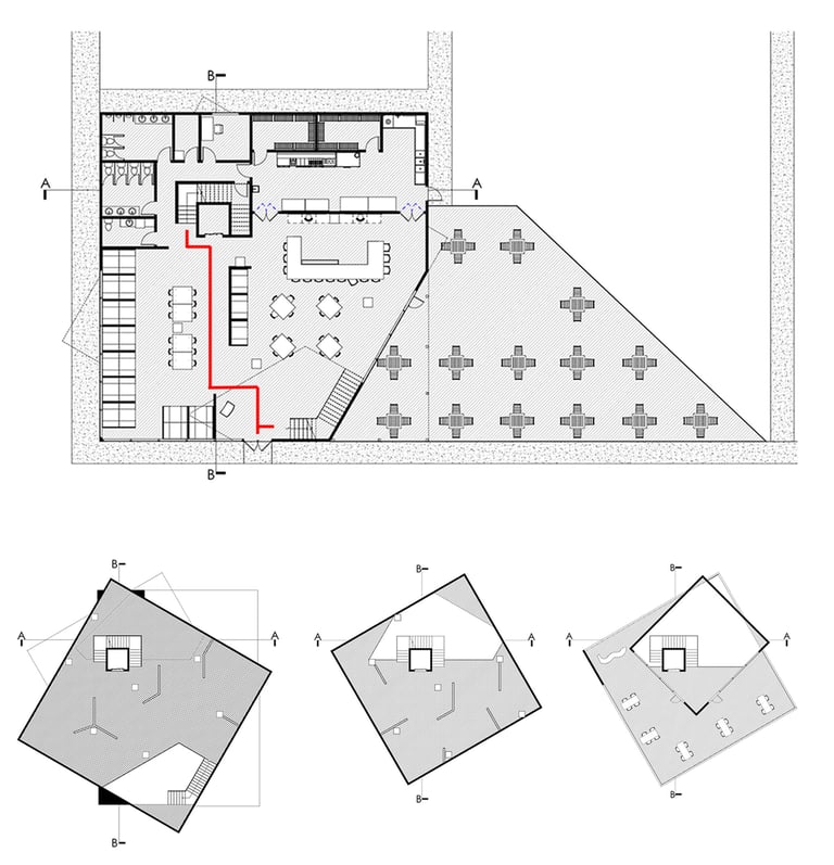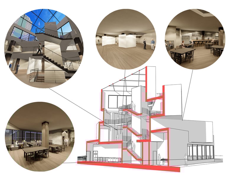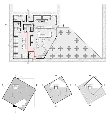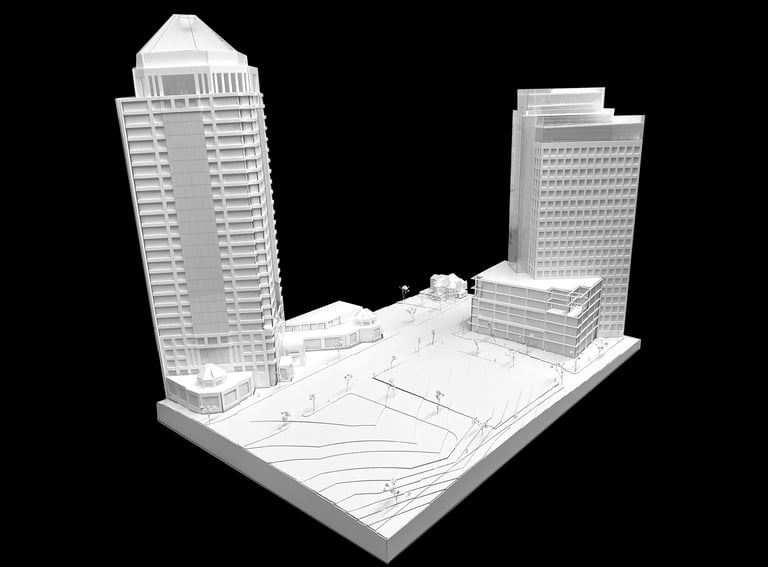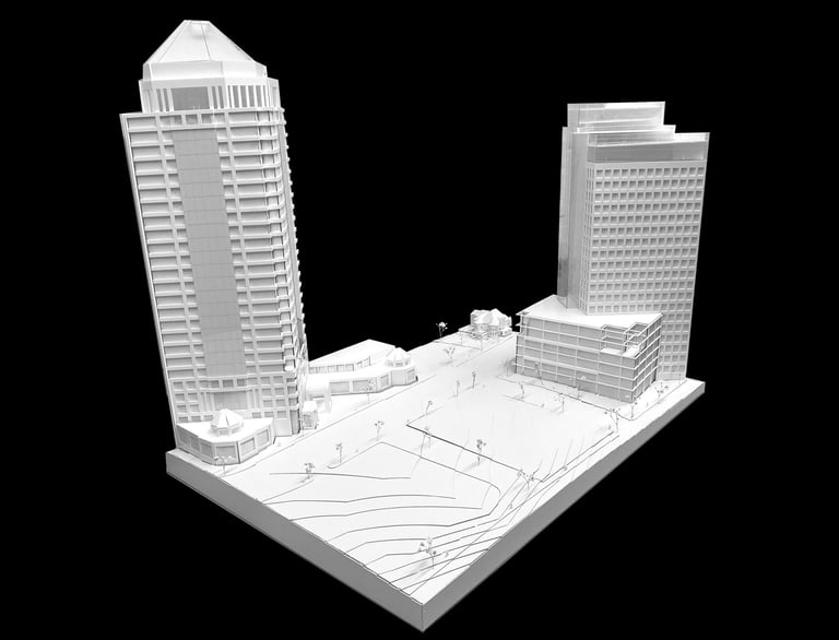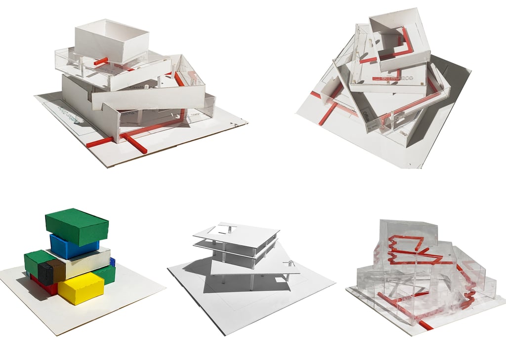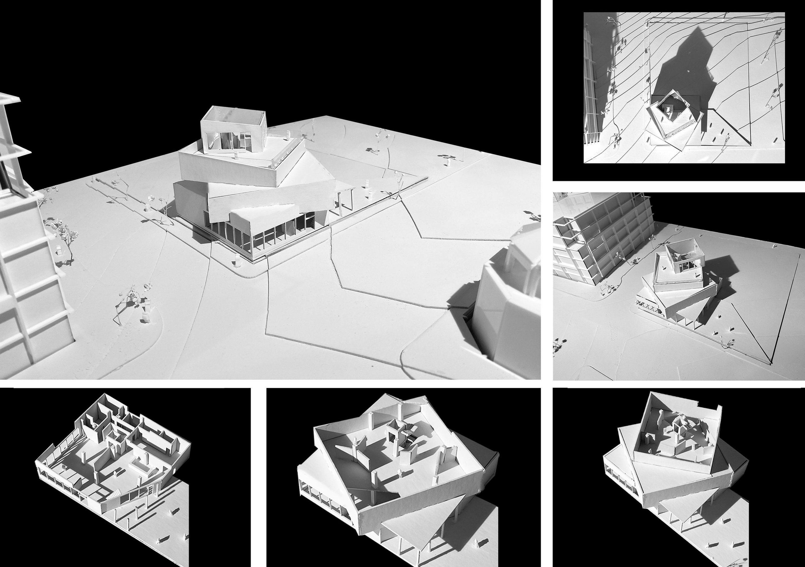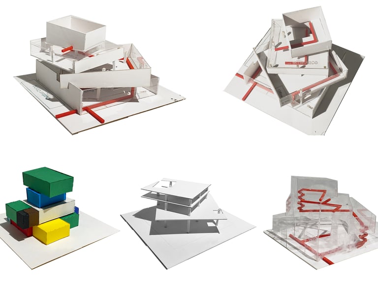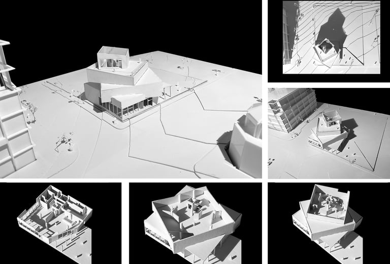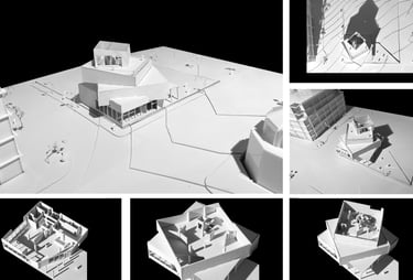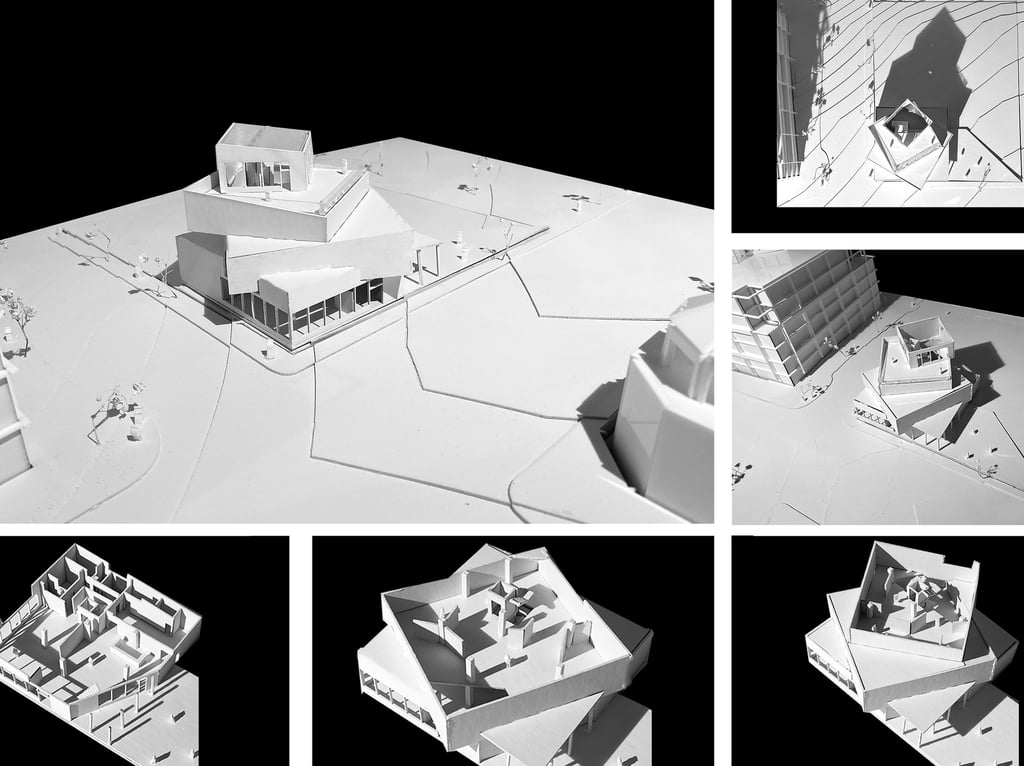 In Studio IV, students were required to design a restaurant and art gallery. During the initial design stages, a site model was produced through a collaborative effort, which helped to envision potential developments for the site. Following this, process massing models were generated at various scales to finalize the massing model for the design. After the creation of these process models, analysis models were developed. These included a programmatic model, a circulation model, a structural model, and an articulation model, all of which were used to inform the analysis before beginning the official design phase.