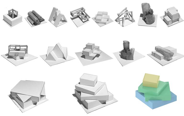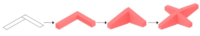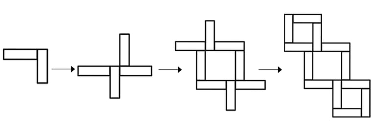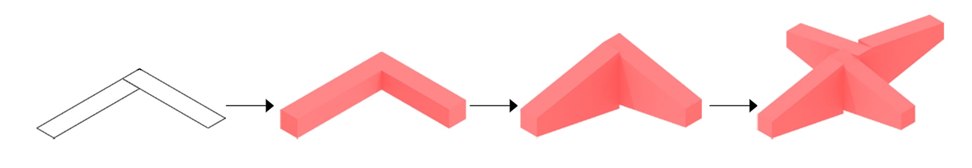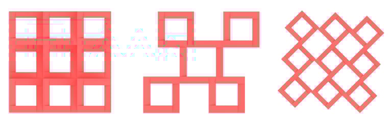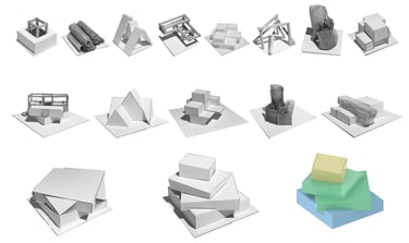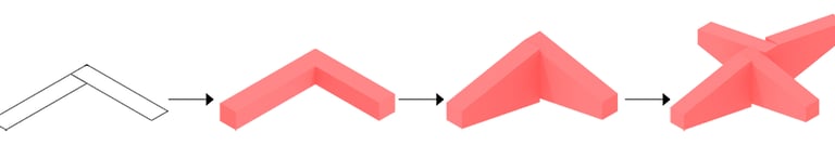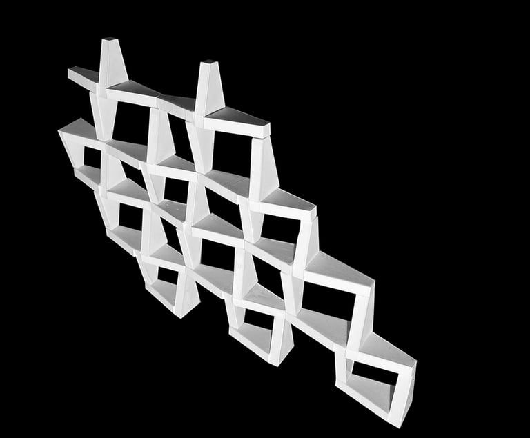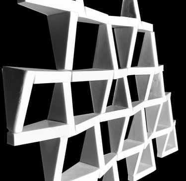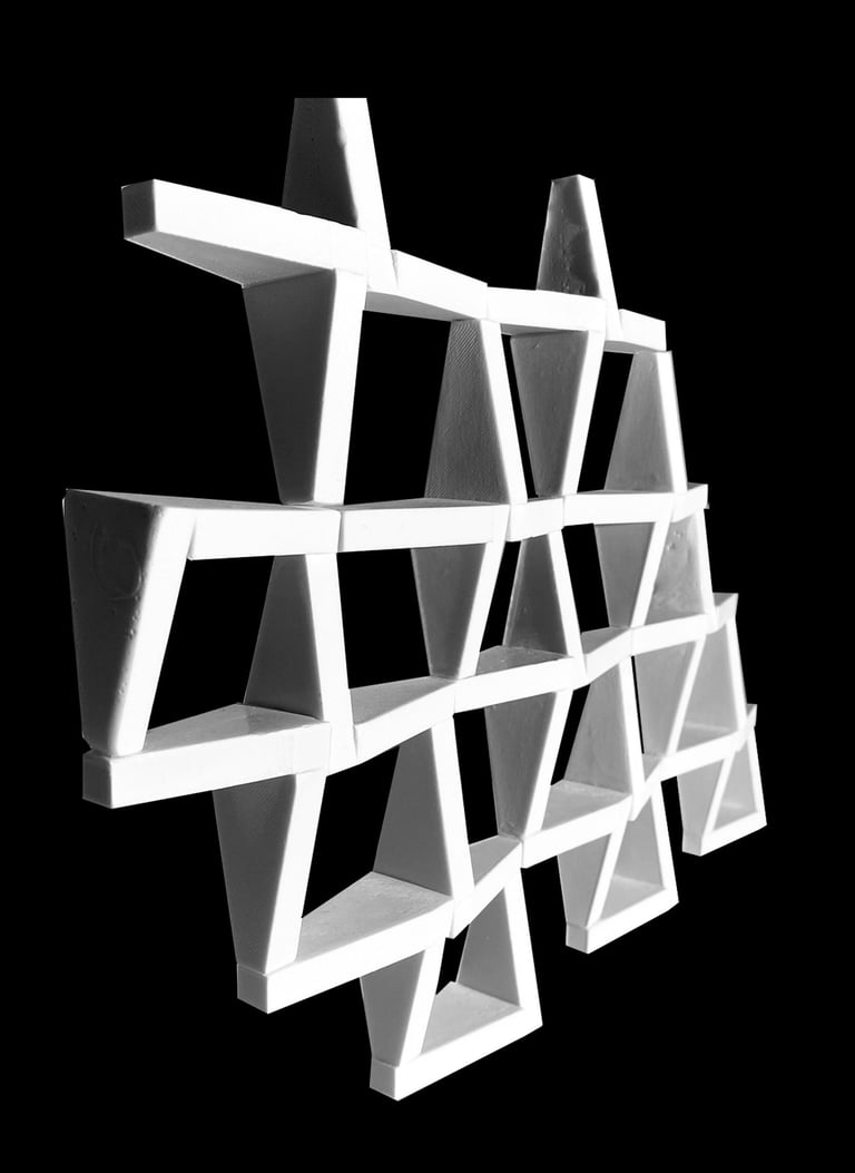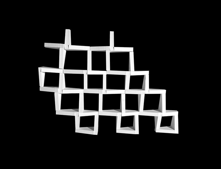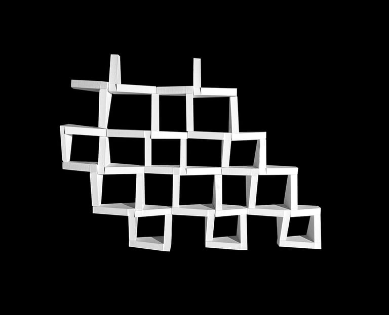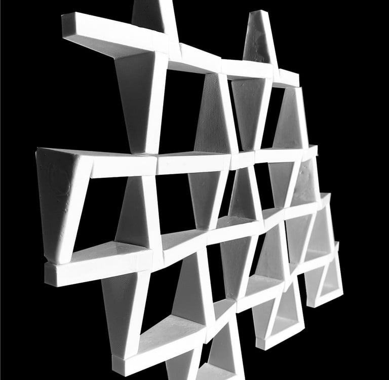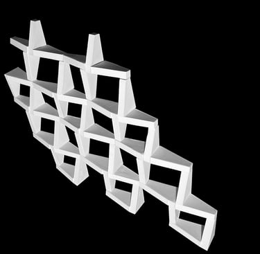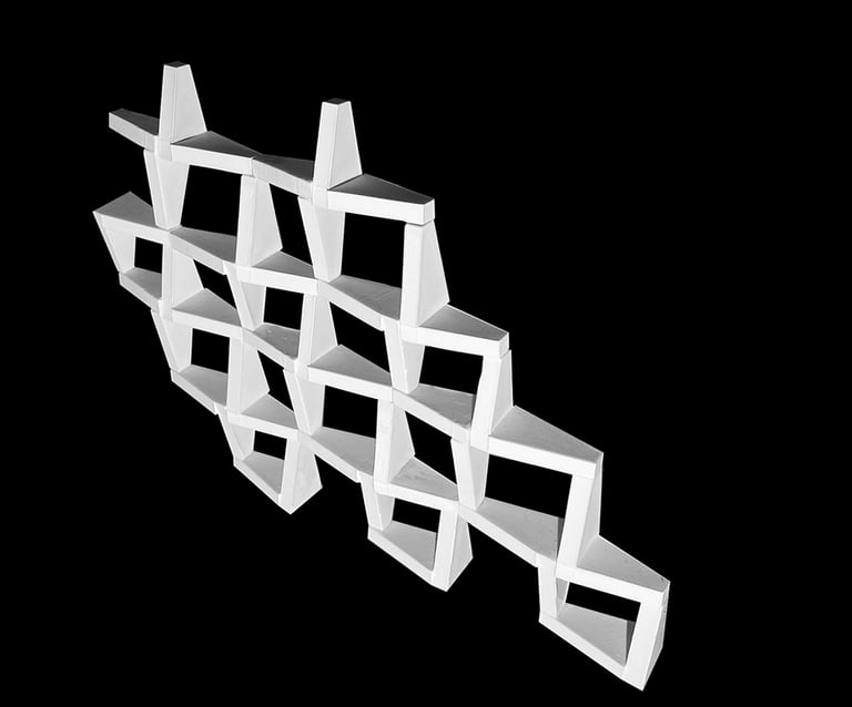 This pattern design was created through a series of steps exploring the architectural significance and possibilities afforded by various patterns, shapes, and modules. Subsequently, a physical prototype was created using mold-making processes and component casting. During the pattern analysis stage, the original pattern, inspired by a bathroom tile, featured rectangles arranged at angles, each overlapping the other. This was followed by the shape analysis stage, where the task was to transform the original pattern into some kind of iteration. After creating a 2D iteration, a three-dimensional shape was developed in the module stage, which was then duplicated to create a final 3D piece. Finally, a negative mold of this shape was produced, into which liquid resin was poured to cast components for the final physical model.