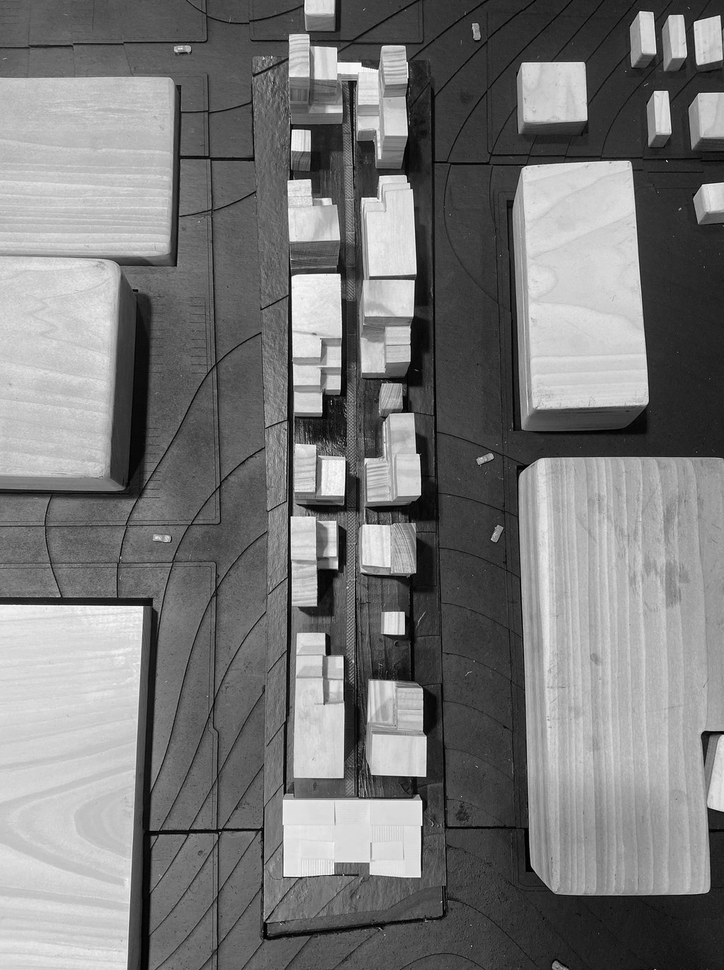 The models created for White's final proposal, The Weekend Complex, included a site model at a scale of 1/32”, which displayed the massings of the twelve individual buildings. There was also a scaled structural model of one of the buildings in Unit 4 at 1’=1-1/2”, along with several additional analysis models.