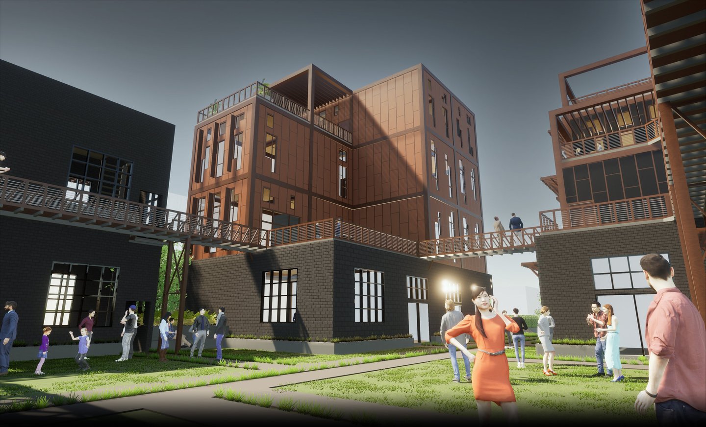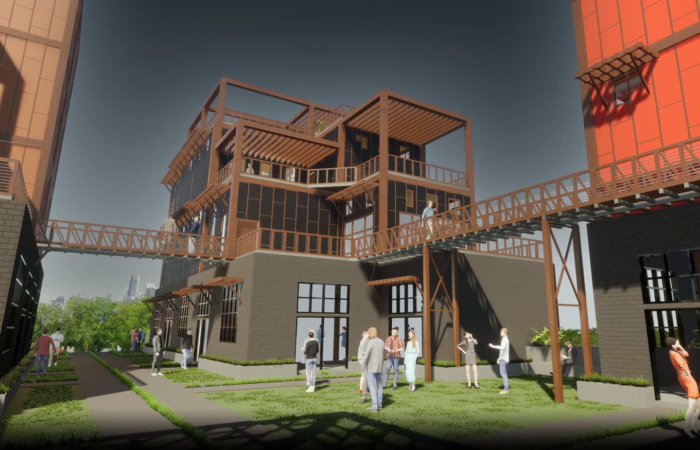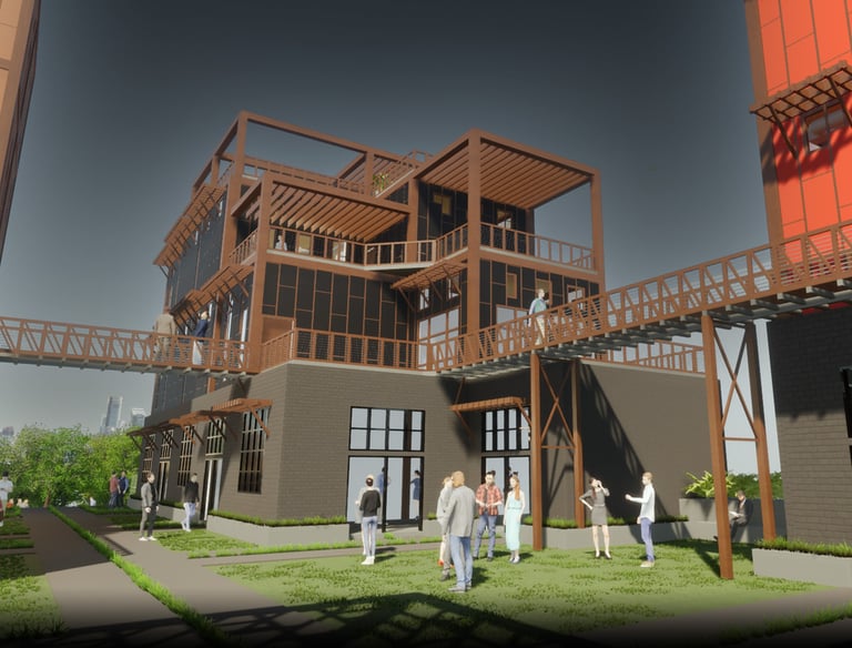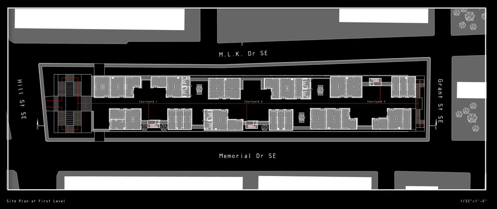 As there are a variety of different types of living spaces in Atlanta, The Weekend is unlike any other. Located at 264 Memorial Drive SE, Atlanta, GA 30312, this upcoming project promotes community engagement. Activity at The Weekend primarily occurs on weekends, making it a bustling place with events like flea markets, farmers markets, and reserved gatherings. The development features twelve individual units, comprising rental spaces and residential areas. The ground floor houses a hidden parking garage, accessible by three fire escape stairs. The first level offers forty rentable spaces for public sales. Two main staircases provide street access to this vibrant area. On the residential side, there are four different units. These designs are replicated three times across the site, each with unique facades. Targeting creative individuals who desire ample space, the units offer lofts, rooftop terraces, and greenhouses. Additionally, each residential unit includes a garage/selling space on the second level, allowing tenants to engage with the public and sell their creative works or belongings during the weekends. Public access to these garage spaces is via the three fire escape stairs and a network of sky bridges throughout the site.