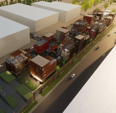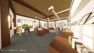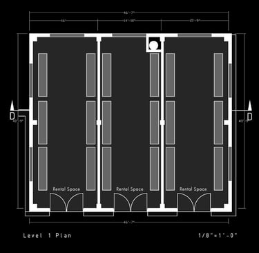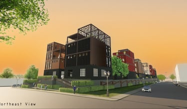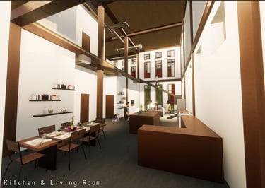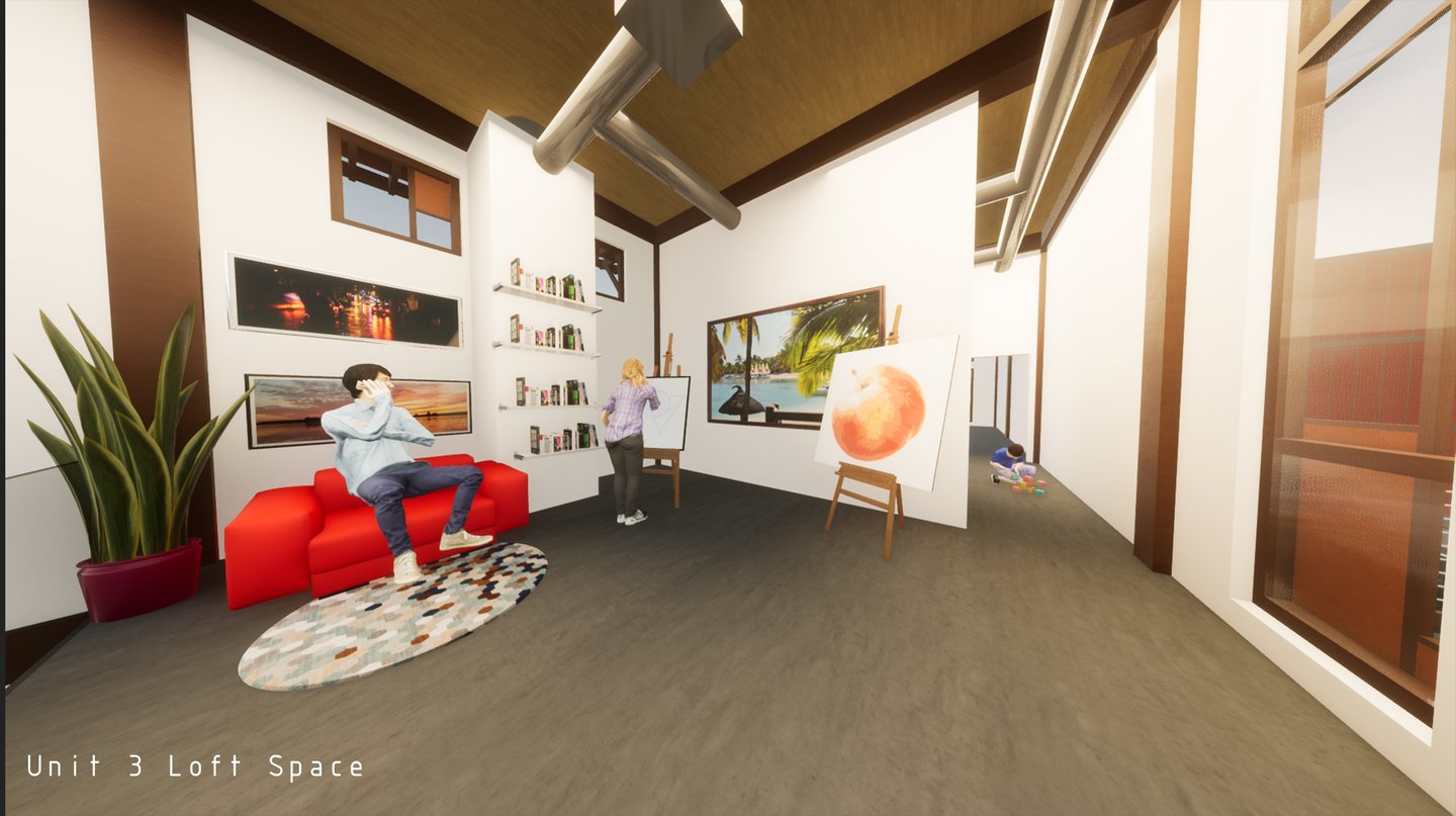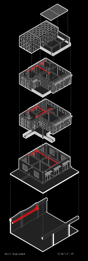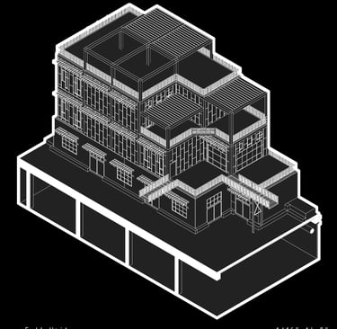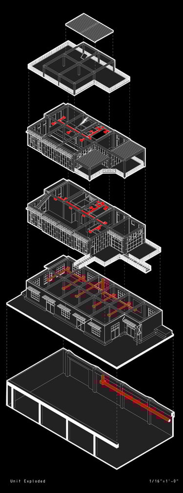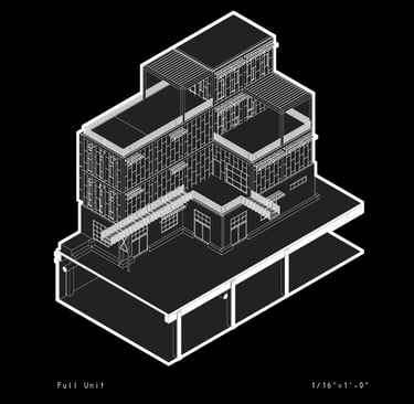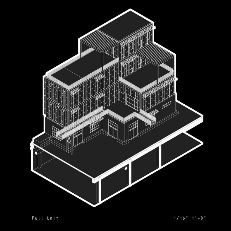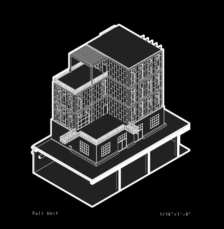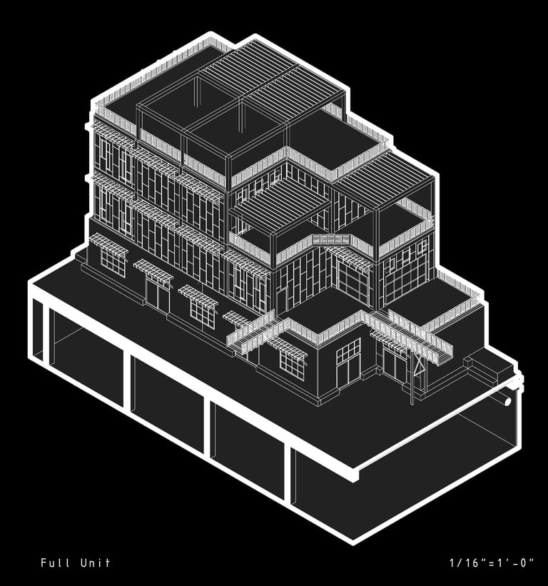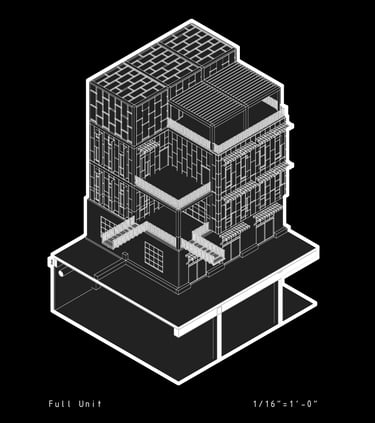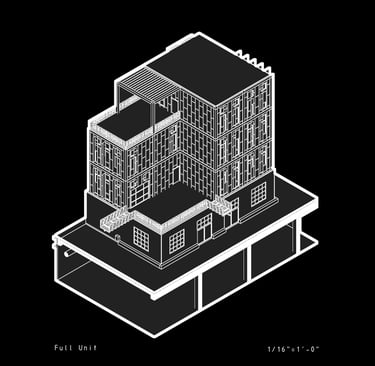 Unit 3 at the Weekend Complex is a distinct unit that appears three times throughout the site. Each of these three units features a different façade and includes both a small and a large rental space. The unit located at the beginning of the site also houses the leasing/rental office. On the residential side, the unit comprises two bedrooms, a half bathroom, a full bathroom, a laundry room, a kitchen, a living room, a large loft space, one rooftop terrace, and a garage/selling space for the tenant. This large unit boasts a very open staircase extending from the second level to the fourth level. With its ample space, it is ideally suited for a creative person who needs a lot of room.