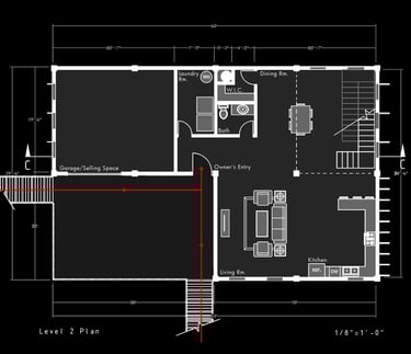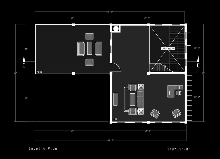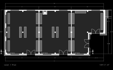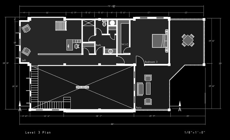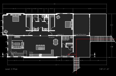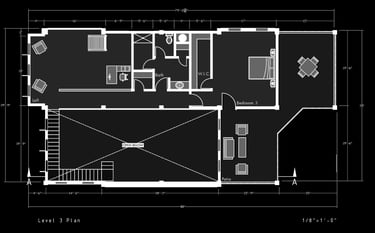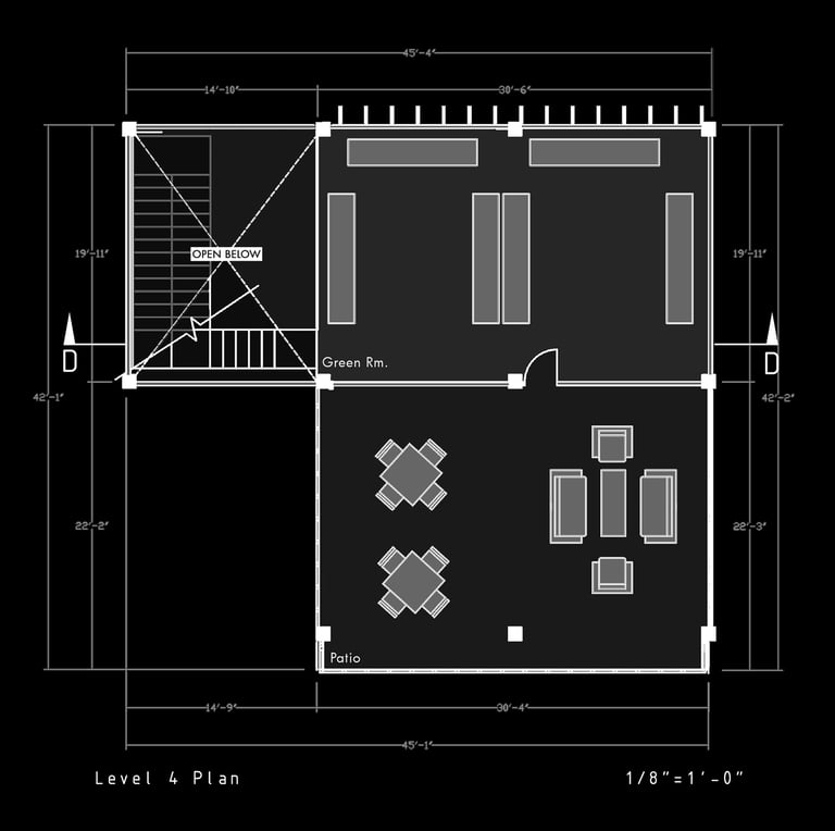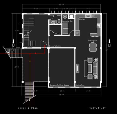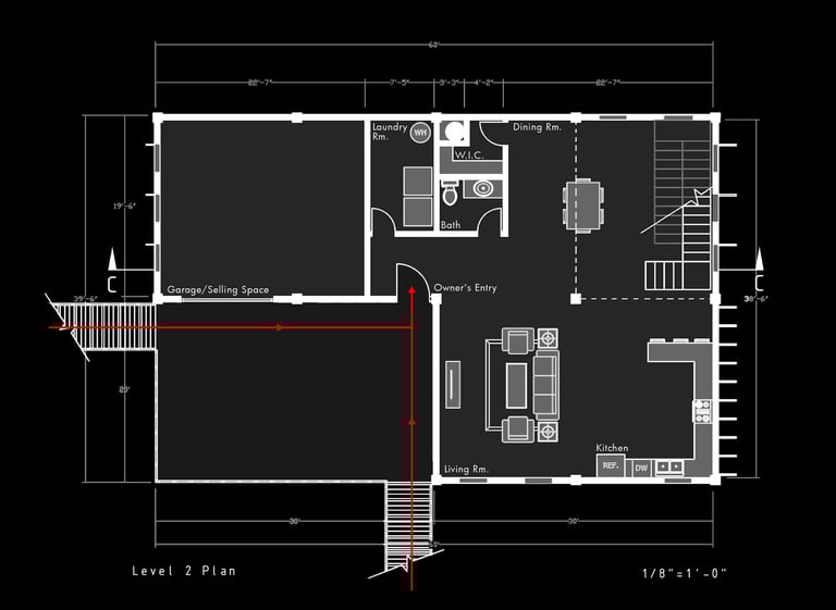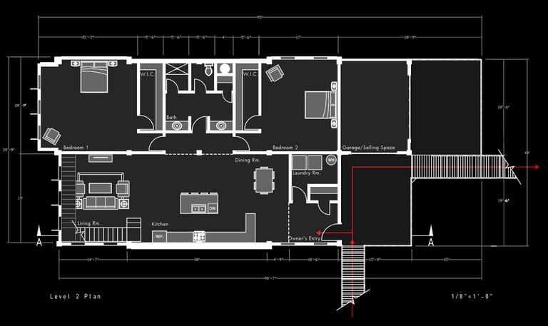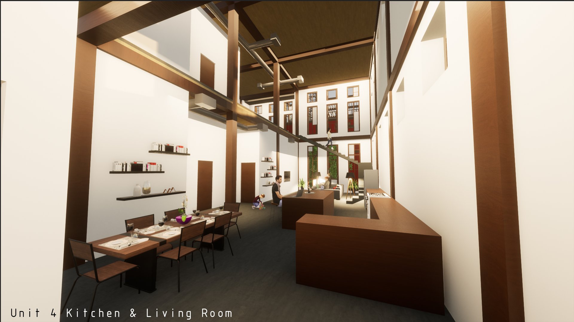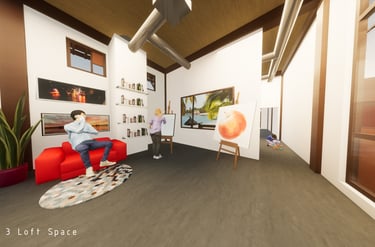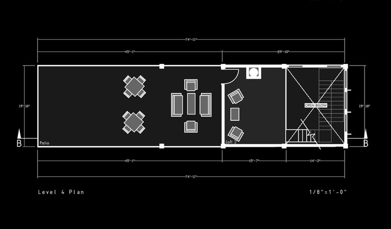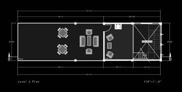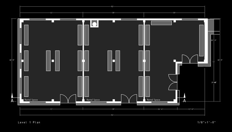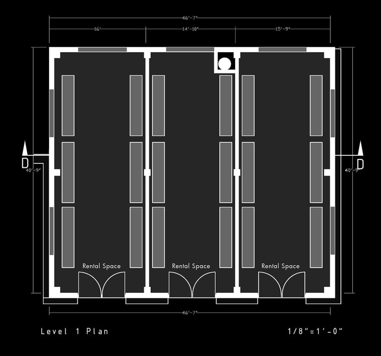 Unit 3 at the Weekend Complex is a distinct unit that appears three times throughout the site. Each of these three units features a different façade and includes both a small and a large rental space. The unit located at the beginning of the site also houses the leasing/rental office. On the residential side, the unit comprises two bedrooms, a half bathroom, a full bathroom, a laundry room, a kitchen, a living room, a large loft space, one rooftop terrace, and a garage/selling space for the tenant. This large unit boasts a very open staircase extending from the second level to the fourth level. With its ample space, it is ideally suited for a creative person who needs a lot of room.