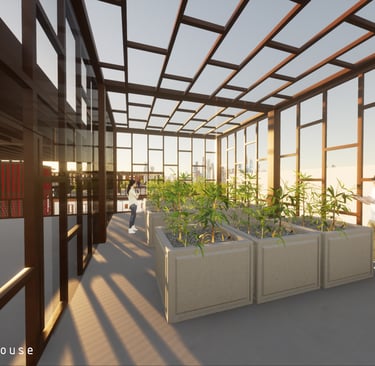 Unit 2 at the Weekend Complex is a unique unit that appears three times throughout the site. Each of these three units has a different façade but shares a common feature: three small rental spaces on the first level. The residential part of the unit includes one bedroom, one half bathroom, one master bathroom, a living room, a kitchen, a laundry room, two rooftop terraces, a green room, and a garage/selling space for the tenant. Although this unit is the smallest among the available units, it is ideal for a couple interested in plant care and requiring ample space.